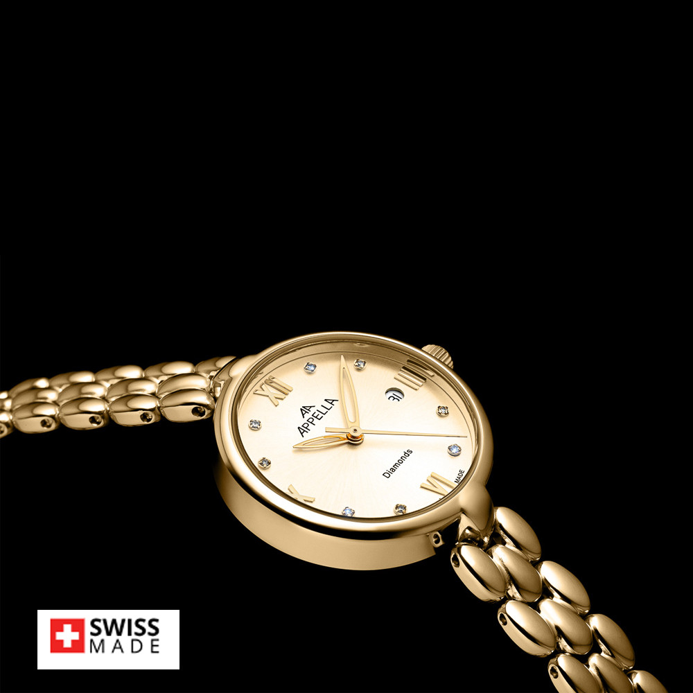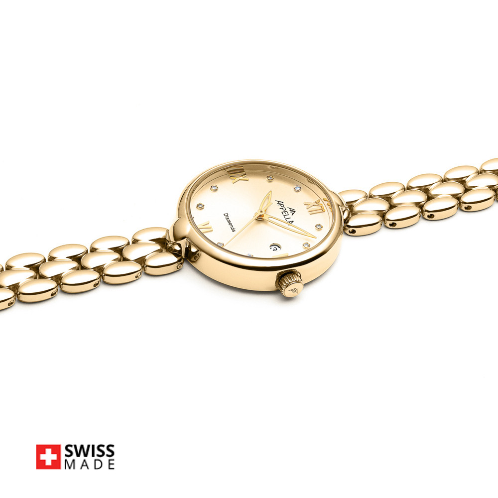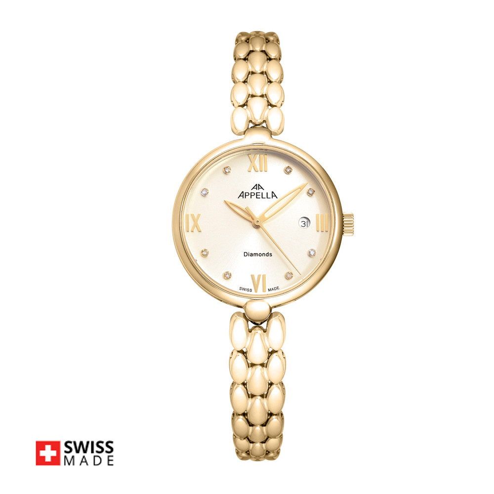 Стилен дамски часовник Appella L50007.1181DQ с нежен дизайн. Моделът е с корпус и верижка изработени от неръждаема стомана. Циферблата е украсен с осем красиви диаманта и допълнен с показател за дата. Стъклото е сапфир-кристал. Задвижва се от кварцов механизъм ETA F04 Swiss Made. Диаметър на корпуса 28 мм. Водоустойчивост 3 ATM - допускат се леки пръски, не се препоръчва обилно мокрене.