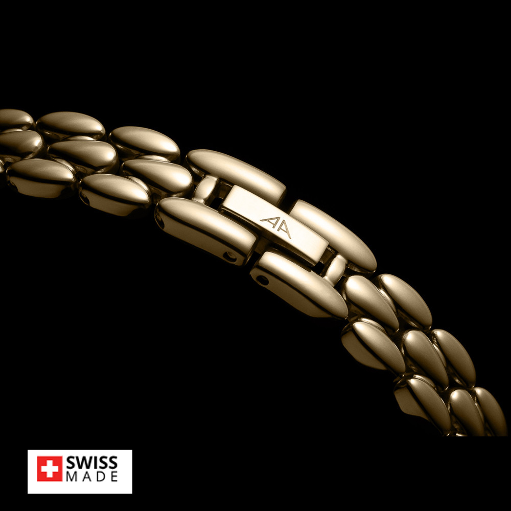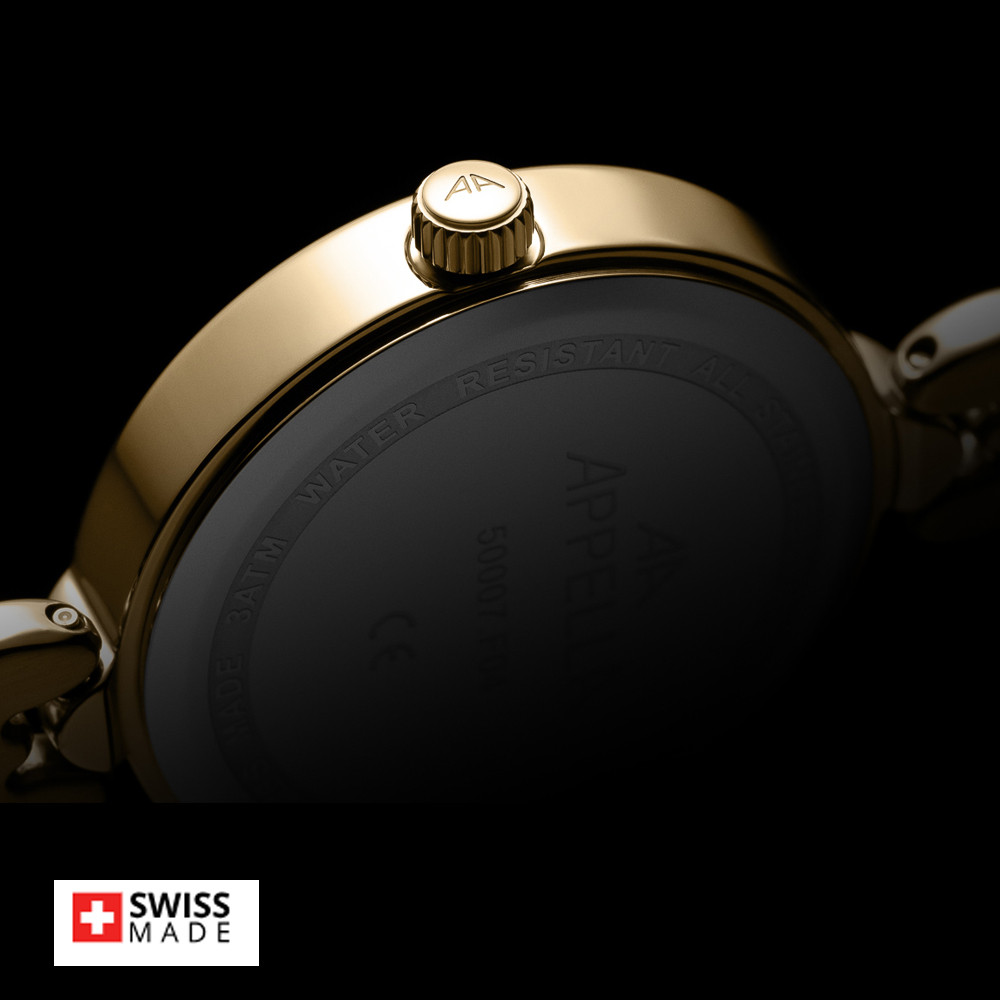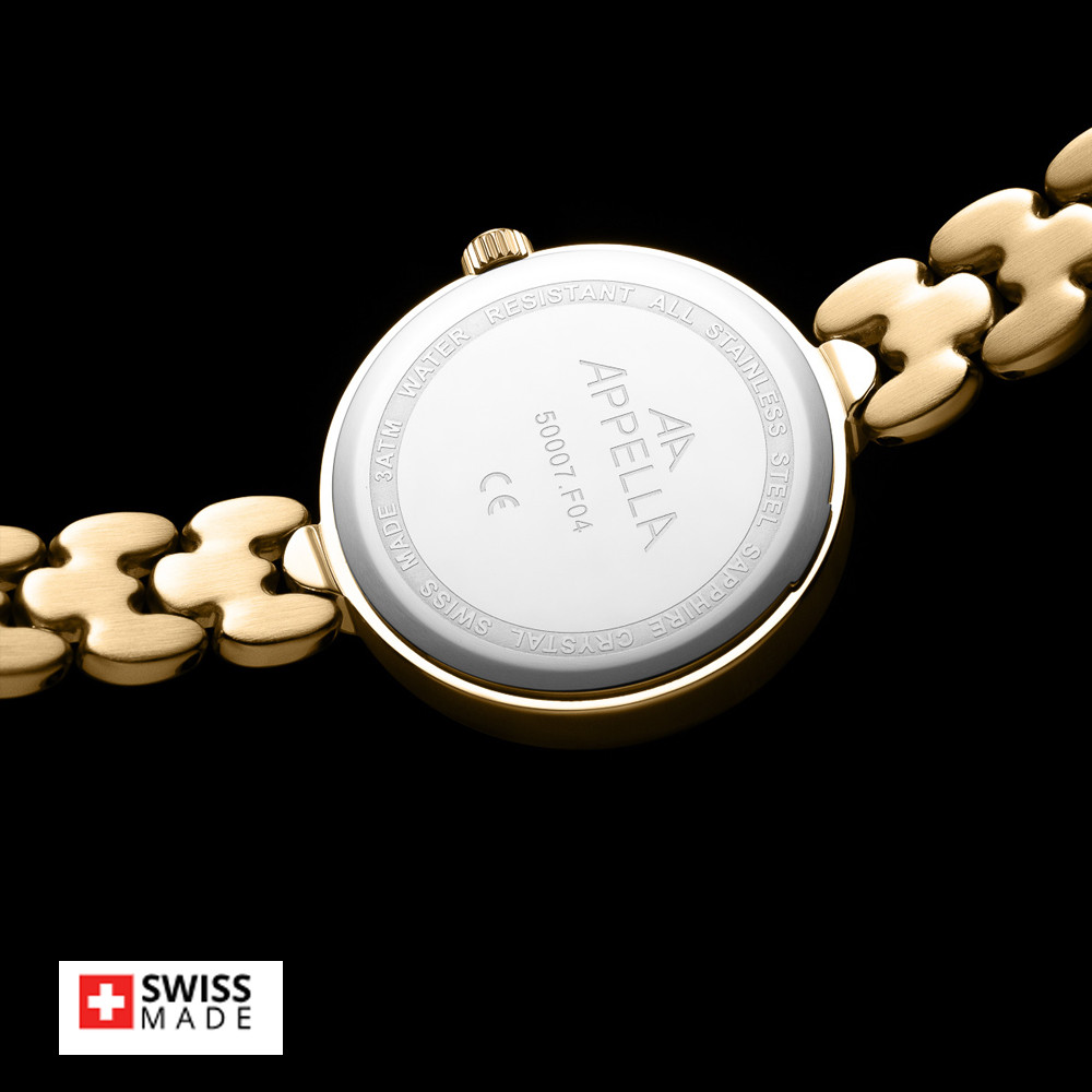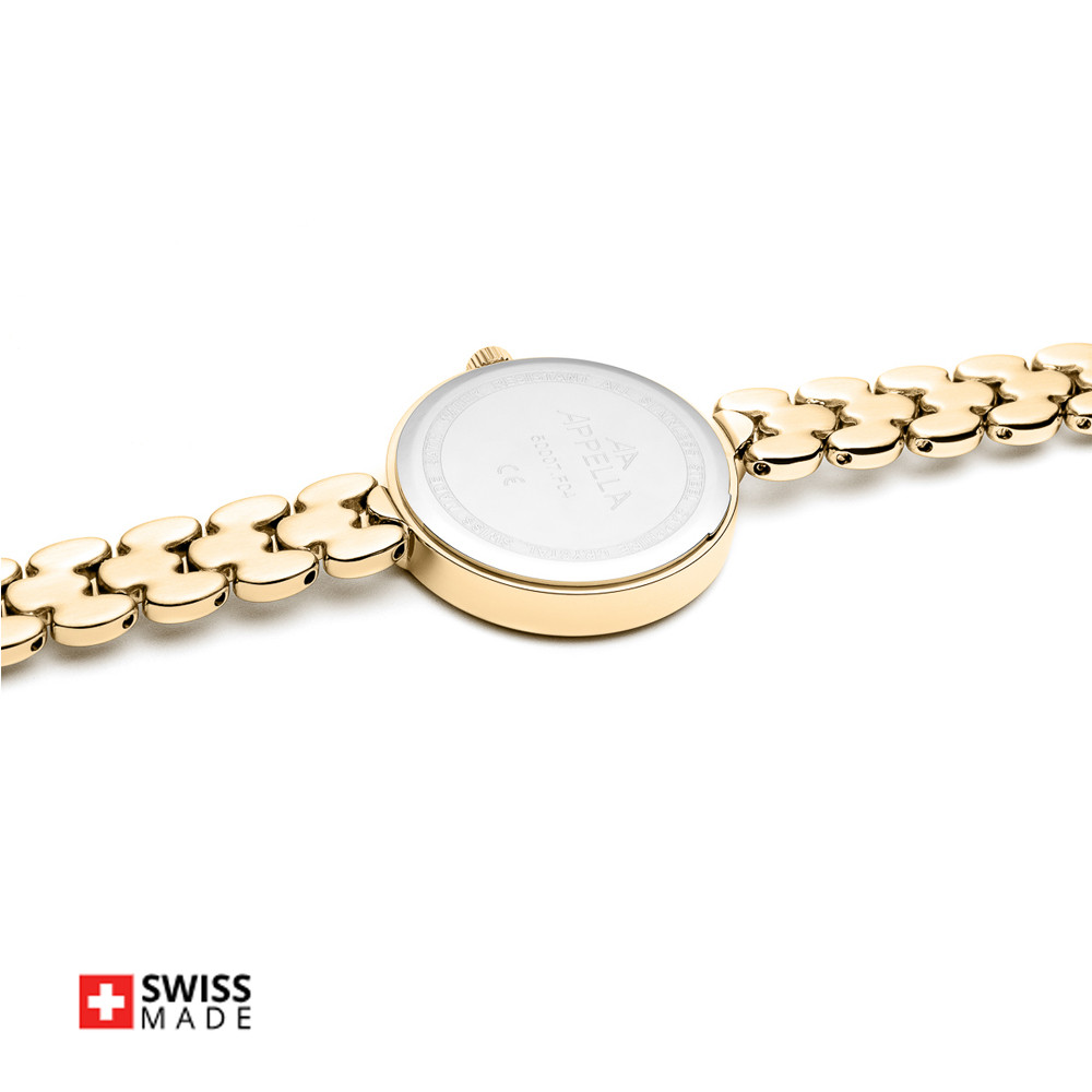 Стилен дамски часовник Appella L50007.1181DQ с нежен дизайн. Моделът е с корпус и верижка изработени от неръждаема стомана. Циферблата е украсен с осем красиви диаманта и допълнен с показател за дата. Стъклото е сапфир-кристал. Задвижва се от кварцов механизъм ETA F04 Swiss Made. Диаметър на корпуса 28 мм. Водоустойчивост 3 ATM - допускат се леки пръски, не се препоръчва обилно мокрене.