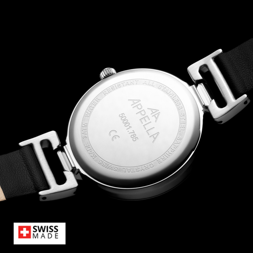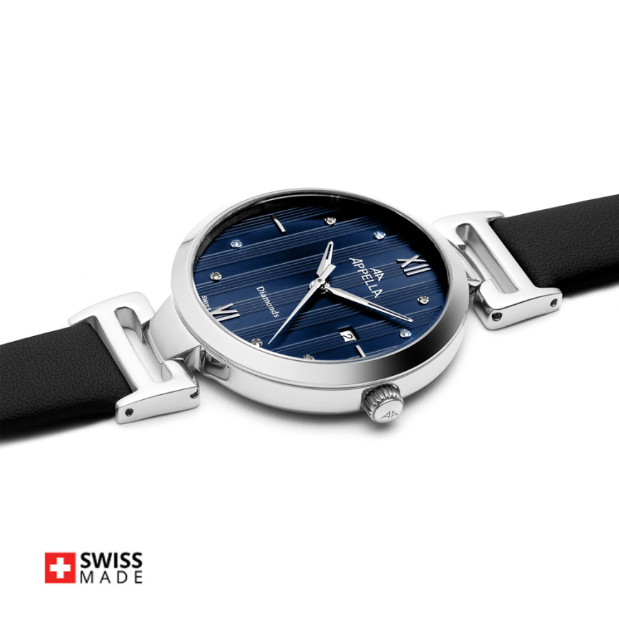 Часовник Appella L50001.5285DQ е елегантен дамски модел, който съчетава изискан стил и швейцарска точност. Корпусът от благородна стомана и каишката от естествена кожа създават усещане за комфорт и класа. Синият циферблат, декориран с осем диаманта и индикатор за дата, придава луксозно излъчване и женствен блясък. Моделът се задвижва от швейцарски кварцов механизъм ETA F04 Swiss Made, осигуряващ надеждна и прецизна работа. Сапфир-кристалното стъкло предпазва часовника от надрасквания, а водоустойчивостта до 3 ATM го прави подходящ за ежедневно носене.