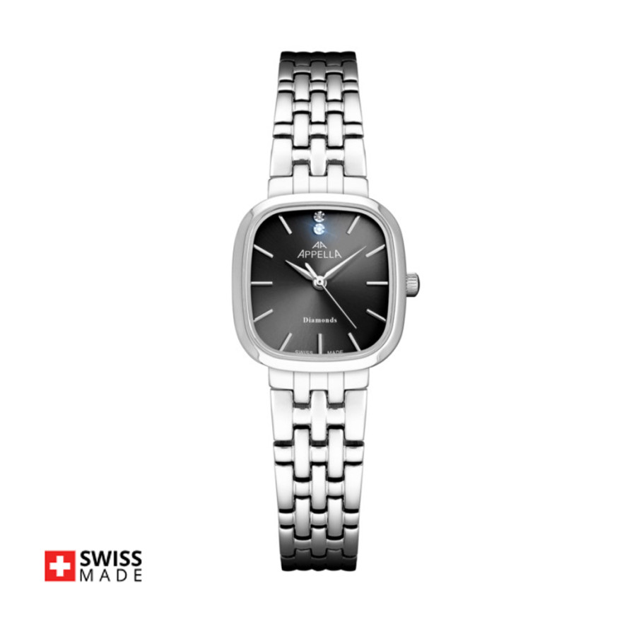 Дамски часовник Appella L50030.5114DQ с класически дизайн. Корпус и верижка изработени от неръждаема стомана. Стъкло сапфир-кристал. Циферблат в черен цвят със сребристи детайли и  два нежни диаманта. Задвижва се от кварцов механизъм Ronda 753 Swiss Made. Водоустойчивост 3 ATM - допускат се леки пръски, не се препоръчва обилно мокрене.
