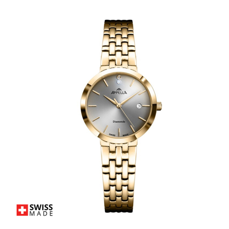 Дамски часовник Appella L50031.1117DQ с корпус и верижка от неръждаема стомана. Диаметър на корпуса 28 мм. Циферблат декориран с два диаманта и допълнен с показател за дата. Стъкло сапфир-кристал. Задвижва се от кварцов механизъм Ronda 785 Swiss Made. Водоустойчивост 3 ATM - допускат се леки пръски, не се препоръчва обилно мокрене.