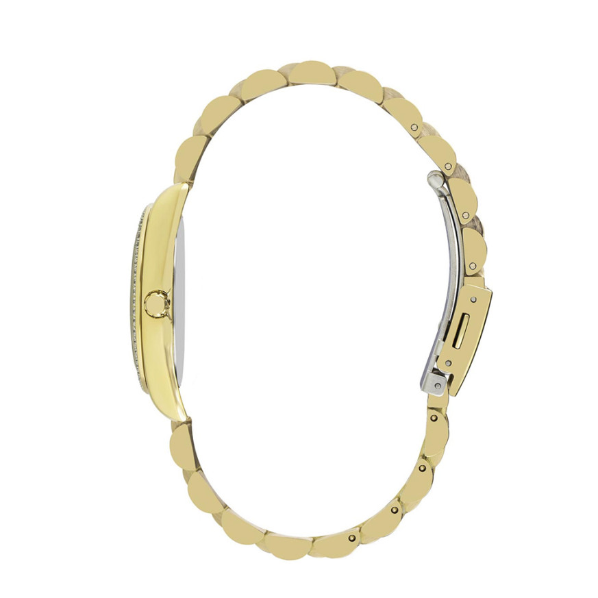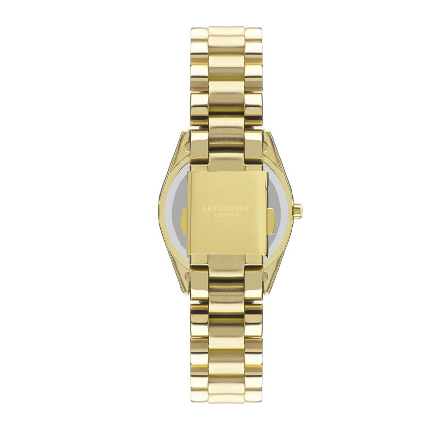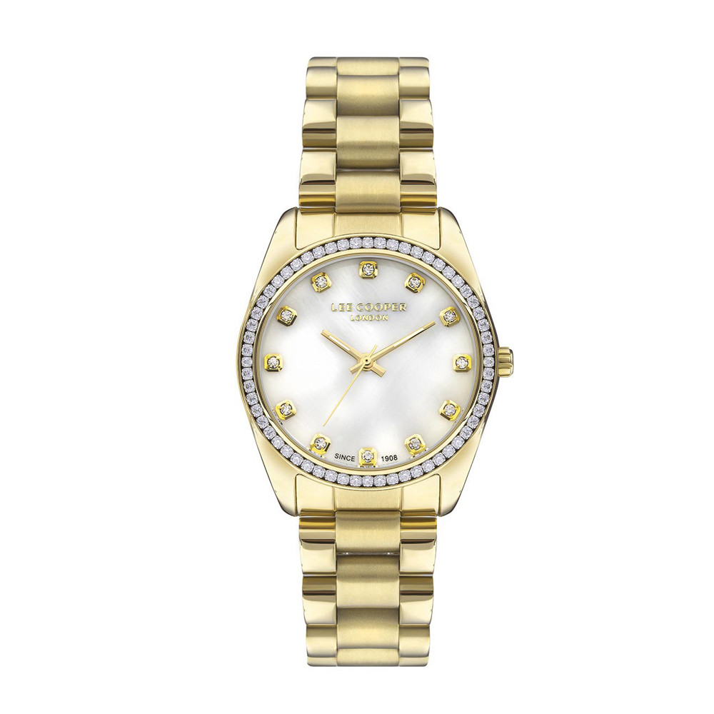 Дамски часовник Lee Cooper със седефен аналогов дисплей и декорация от инкрустирани камъни. Моделът е с корпус от супер метал, съчетан с верижка от неръждаема стомана. Диаметър на корпуса 34мм. Стъклото е минерал-кристал. Задвижва се от кварцов механизъм. Водоустойчивост 3 ATM - допускат се леки пръски, не се препоръчва обилно мокрене.