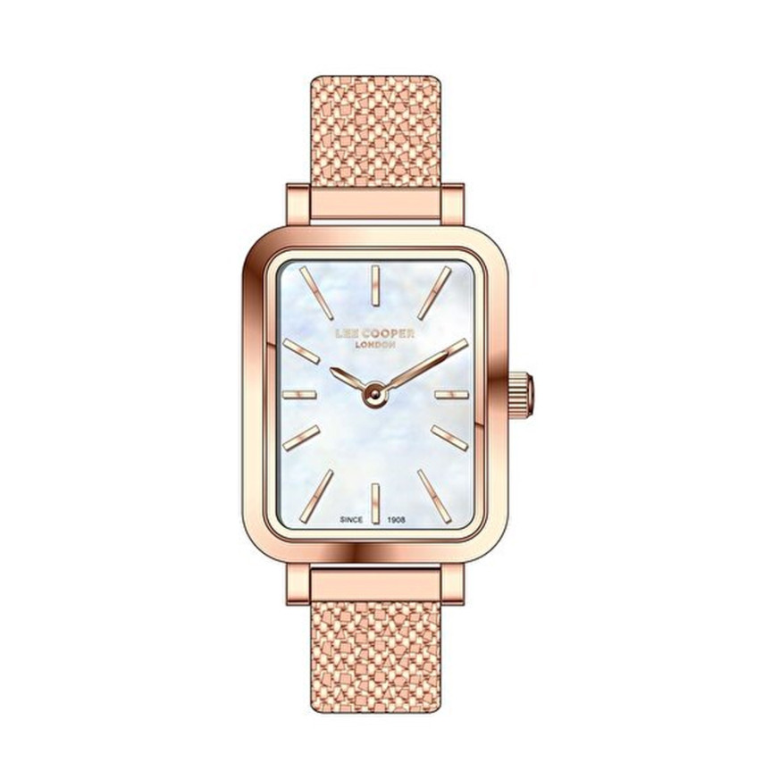 Дамски часовник Lee Cooper със стилен дизайн от колекцията Elegance. Корпус изработен от супер метал - специална сплав, създадена от марката. Верижка ситна плетка от неръждаема стомана. Аналогов дисплей в нежен седефен цвят. Стъкло минерал-кристал. Задвижва се  от кварцов механизъм. Водоустойчивост 3 ATM - допускат се леки пръски, не се препоръчва обилно мокрене.