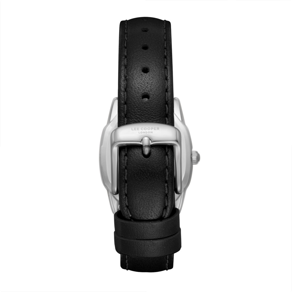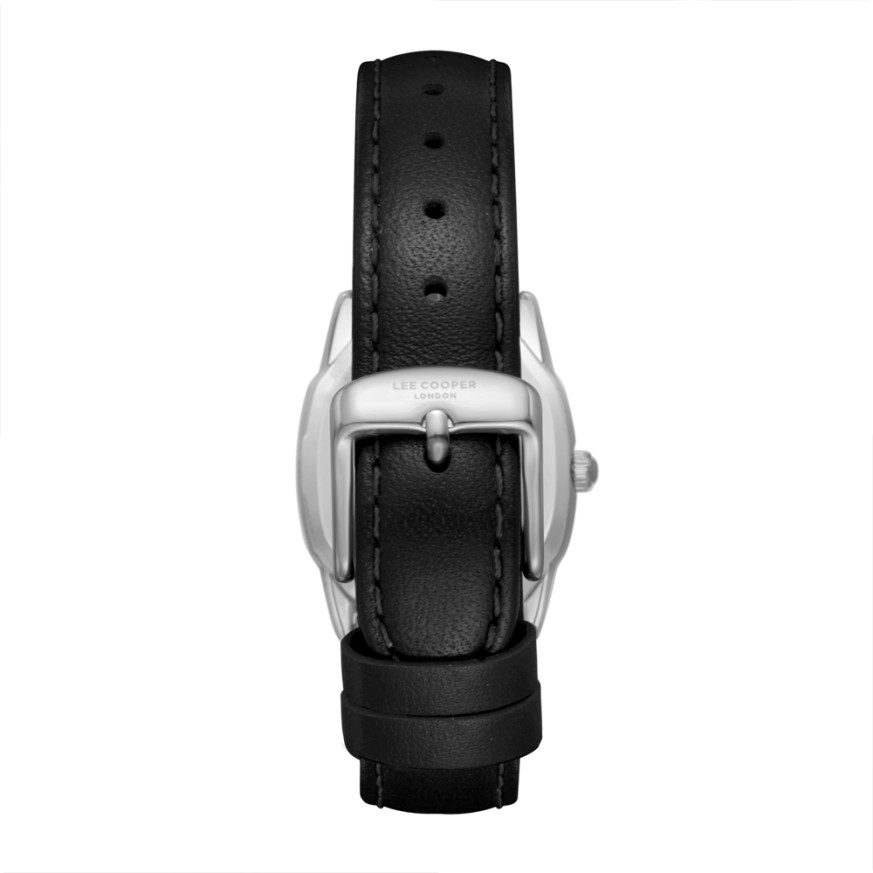 Класически модел дамски часовник Lee Cooper със стилна визия от колекцията Elegance. Корпус от супер метал в комбинация с каишка от естествена кожа. Стъкло минерал-кристал. Аналогов дисплей в черен цвят със сребристи стрелки и бели римски цифри. Задвижва се от кварцов механизъм. Водоустойчивост 3 ATM - допускат се леки пръски, не се препоръчва обилно мокрене.
