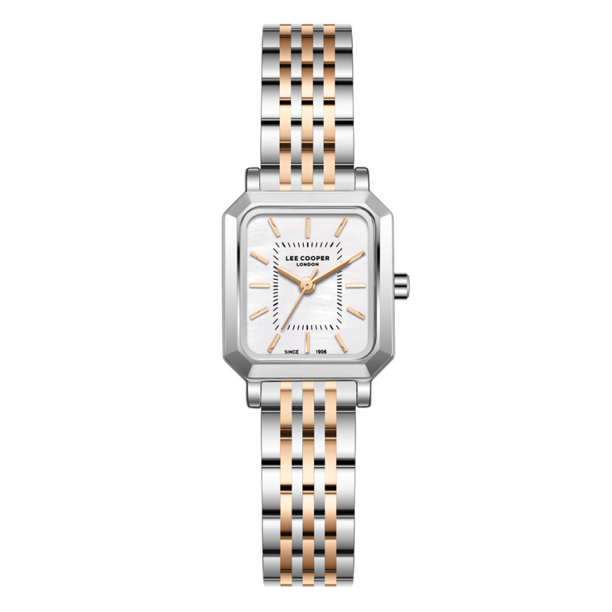 Дамски часовник Lee Cooper с класическа визия от колекцията Elegance. Корпус от супер метал в комбинация с верижка от неръждаема стомана. Аналогов дисплей в нежен седефен цвят с индекси и стрелки в цвят розово злато. Стъкло минерал-кристал. Задвижва се от кварцов механизъм. Водоустойчивост 3 ATM - допускат се леки пръски, не се препоръчва обилно мокрене.