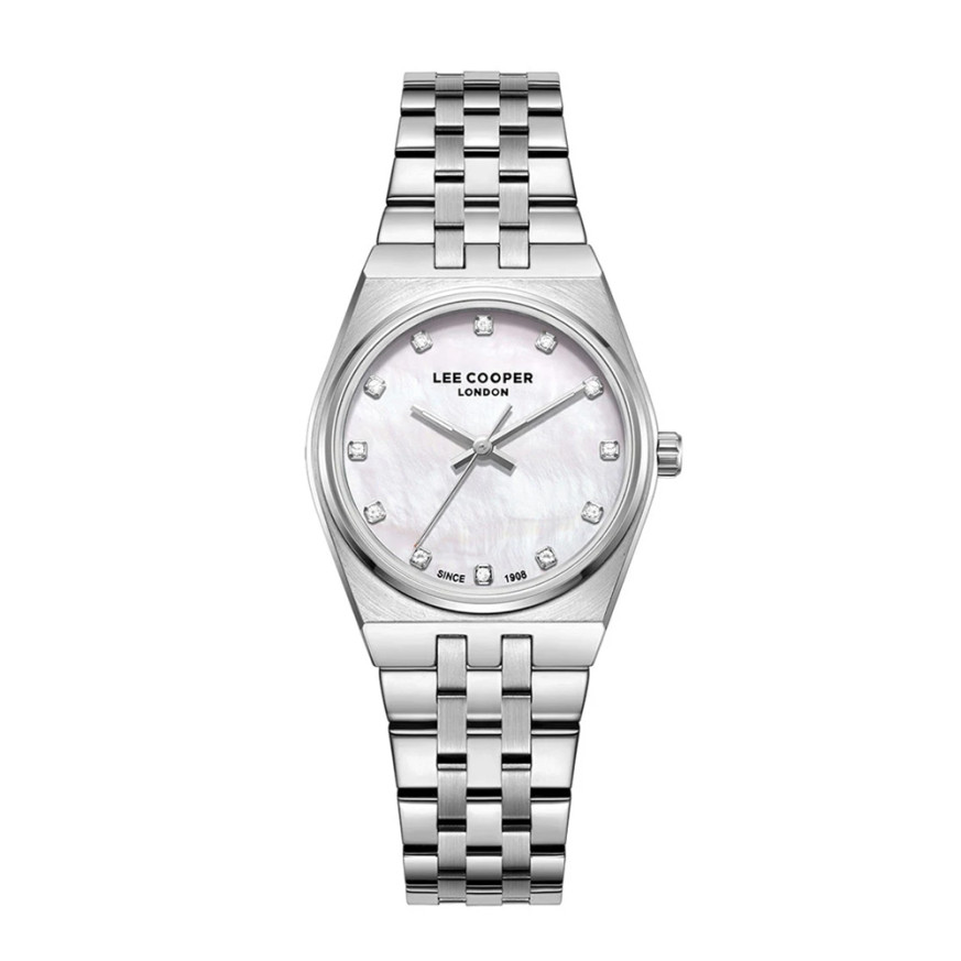 Красив дамски часовник Lee Cooper от колекцията Elegance. Моделът е с корпус от супер метал и верижка от неръждаема стомана. Диаметър на корпуса 30 мм. Аналогов дисплей в нежен седефен цвят и с декорация от кристали. Стъкло минерал-кристал. Задвижва се от кварцов механизъм. Водоустойчивост 3 ATM - допускат се леки пръски, не се препоръчва обилно мокрене.