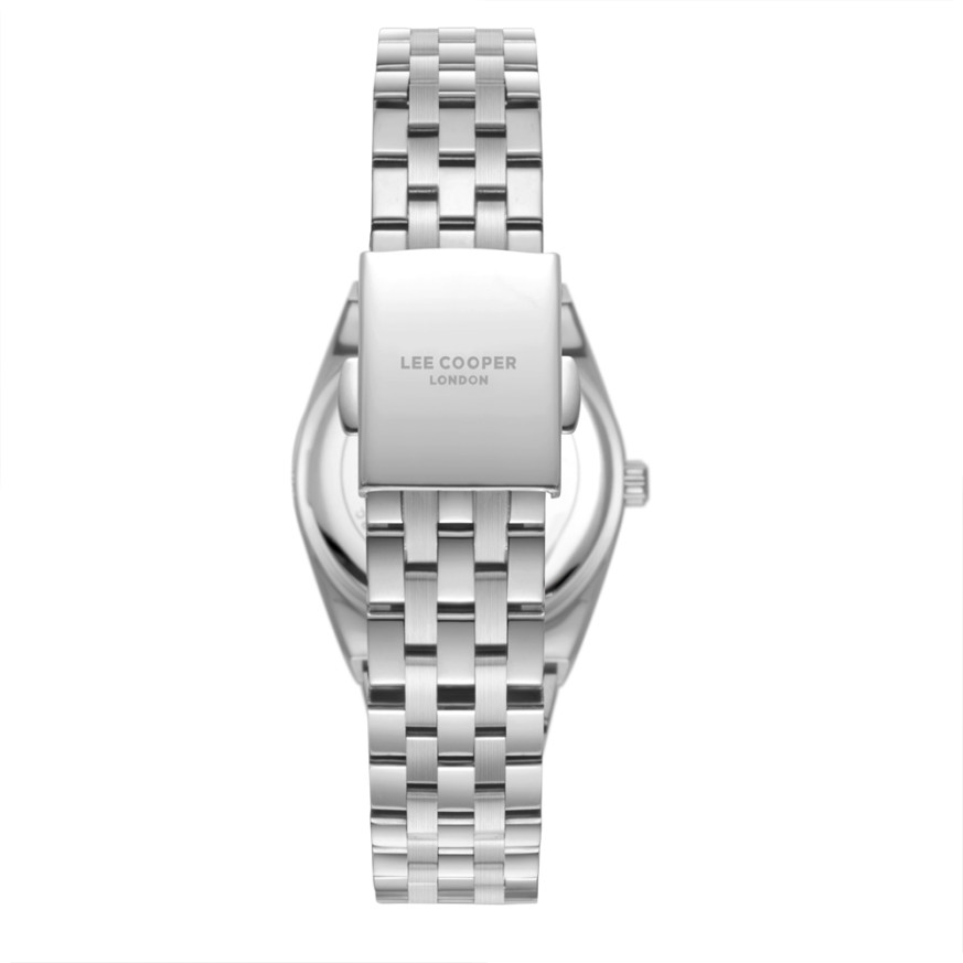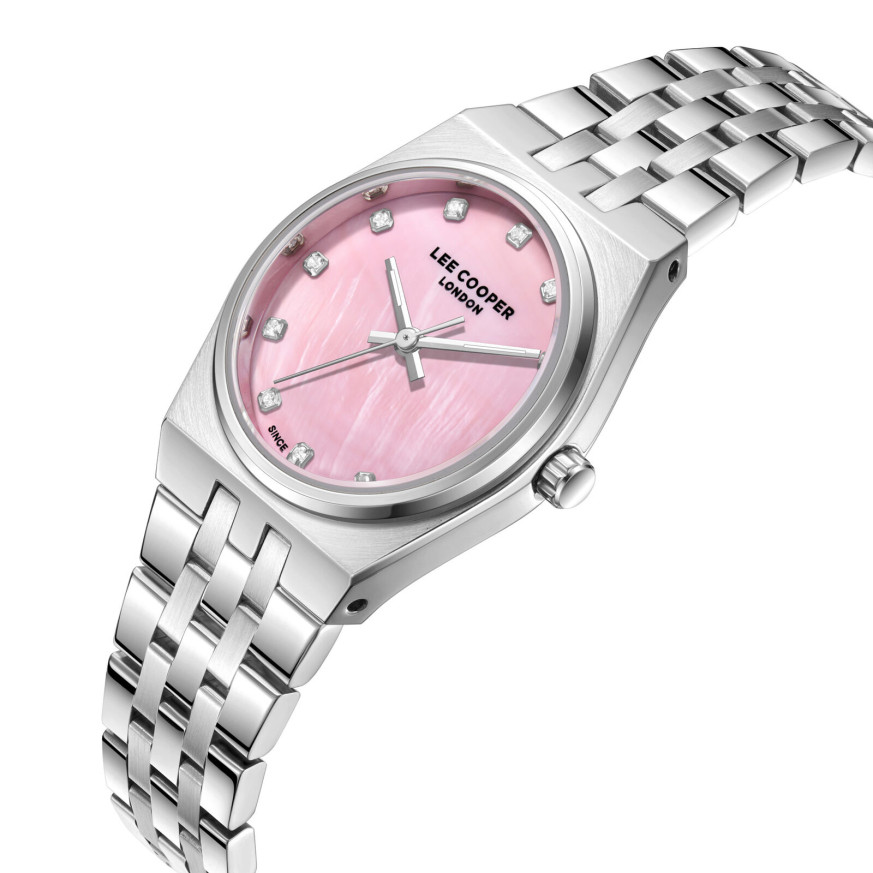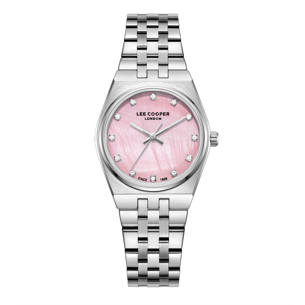 Красив дамски часовник Lee Cooper от колекцията Elegance. Моделът е с корпус от супер метал и верижка от неръждаема стомана. Диаметър на корпуса 30 мм. Седефен анаогов дисплей в розов цвят и декорация от кристали. Стъкло минерал-кристал. Задвижва се от кварцов механизъм. Водоустойчивост 3 ATM - допускат се леки пръски, не се препоръчва обилно мокрене.
