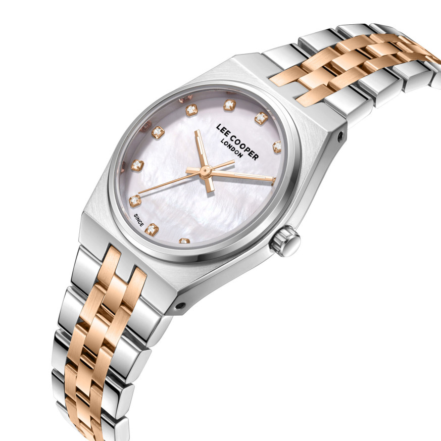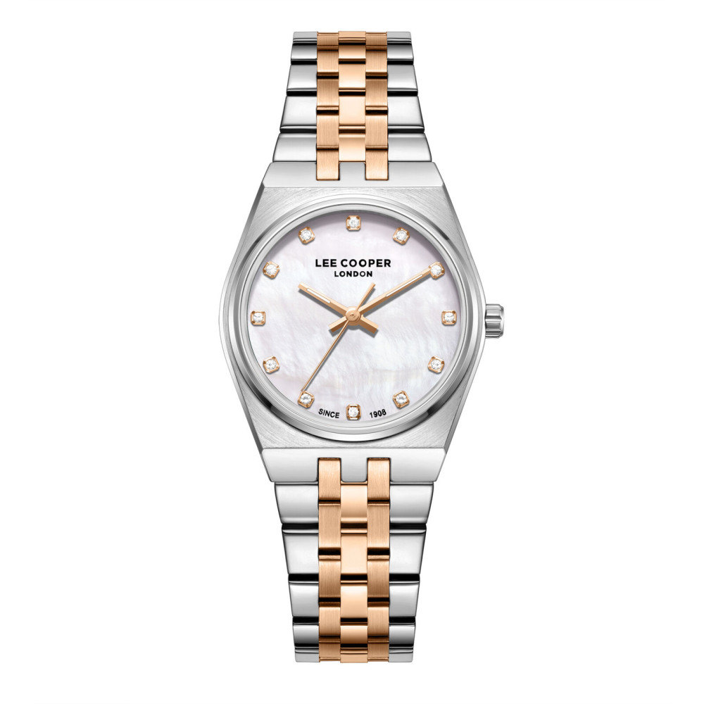 Красив дамски часовник Lee Cooper от колекцията Elegance. Моделът е с корпус от супер метал и верижка от неръждаема стомана. Диаметър на корпуса 30 мм. Аналогов дисплей в нежен седефен цвят и декорация от кристали. Стъкло минерал-кристал. Задвижва се от кварцов механизъм. Водоустойчивост 3 ATM - допускат се леки пръски, не се препоръчва обилно мокрене.