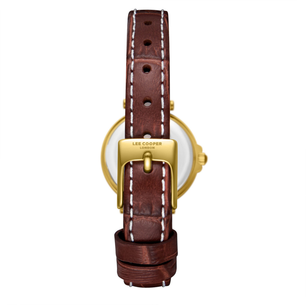 Дамски часовник Lee Cooper с класически дизайн.Корпус изработен от супер метал. Кафява каишка от естествена кожа с декоративни бели шевове. Диаметър на корпуса 24 мм. Аналогов дисплей в бял цвят със сини стрелки и черни римски цифри. Стъкло минерал-кристал. Задвижва се от кварцов механизъм. Водоустойчивост 3 ATM - допускат се леки пръски, не се препоръчва обилно мокрене.