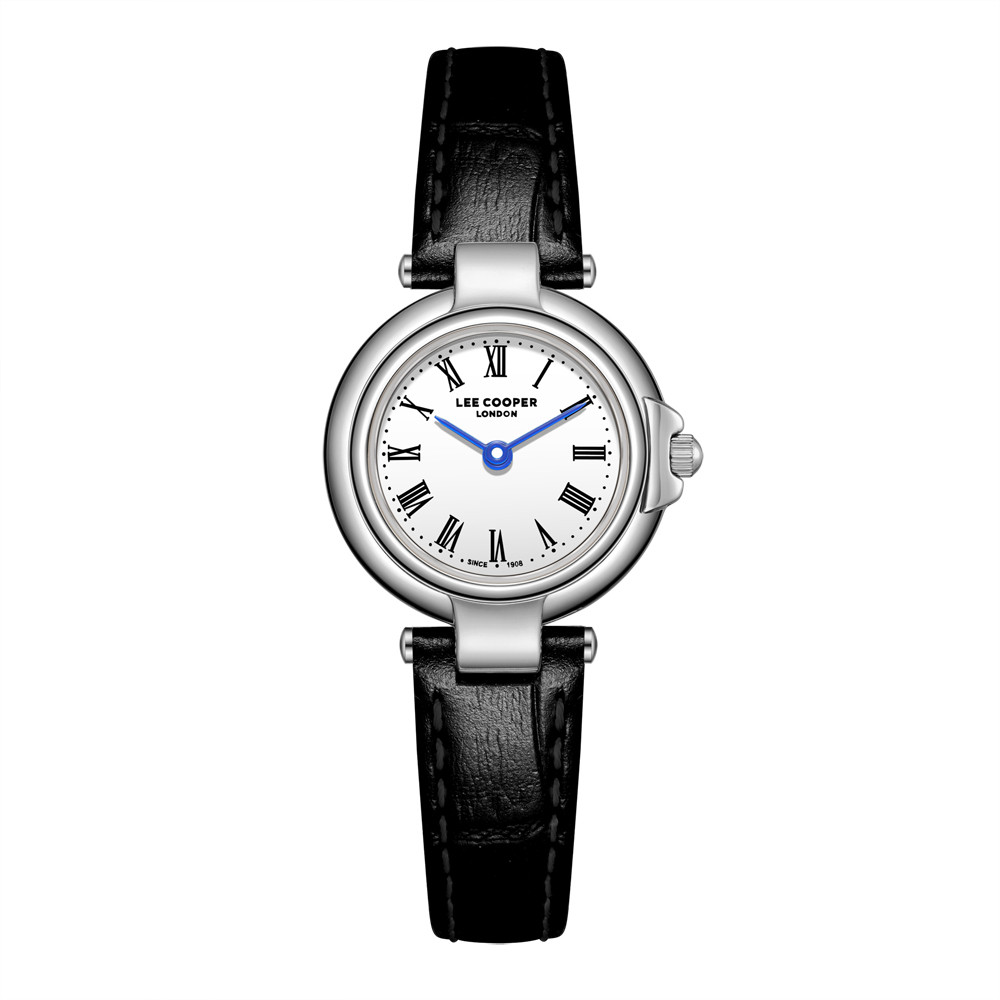 Дамски часовник Lee Cooper с класически дизайн.Корпус изработен от супер метал. Каишка от естествена кожа в черен цвят. Диаметър на корпуса 24 мм. Аналогов дисплей в бял цвят със сини стрелки и черни римски цифри. Стъкло минерал-кристал. Задвижва се от кварцов механизъм. Водоустойчивост 3 ATM - допускат се леки пръски, не се препоръчва обилно мокрене.