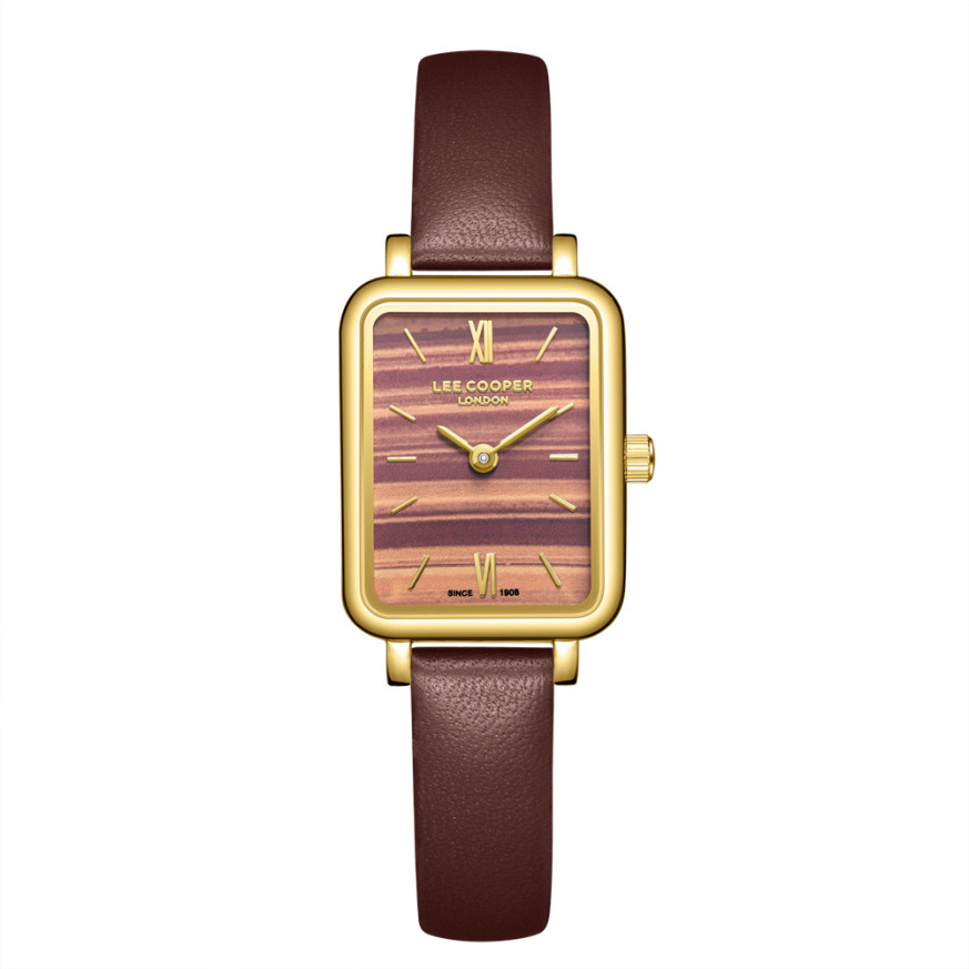 Класически модел часовник Lee Cooper със стилен дизайн. Корпус изработен от супер метал. Каишка от естествена кожа. Аналогов дисплей в преливащи кафяви нюанси със златисти детайли. Стъкло минерал-кристал. Задвижва се от кварцов механизъм. Водоустойчивост 3 ATM - допускат се леки пръски, не се препоръчва обилно мокрене.