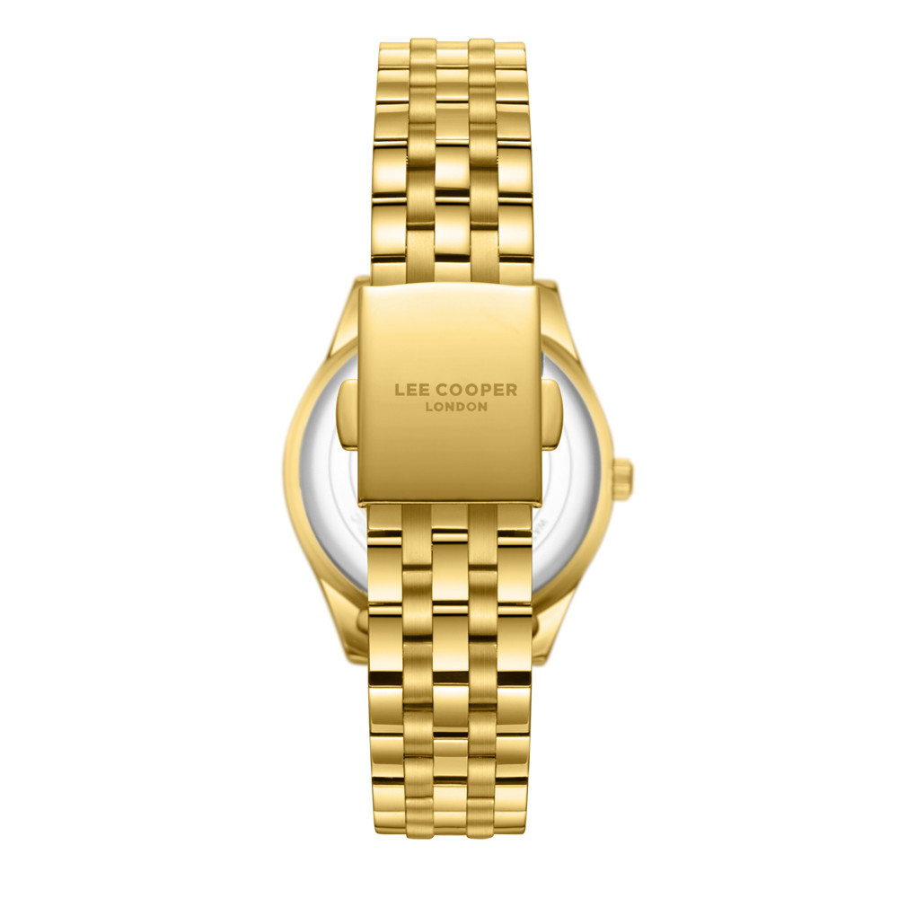 Стилен дамски часовник Lee Cooper от колекцията Elegance. Моделът е с декорация от нежни кристали по безела и дисплея. Корпус изработен от супер метал. Верижка от неръждаема стомана. Диаметър на корпуса 33 мм. Аналогов дисплей в седефен цвят. Стъкло минерал-кристал. Задвижва се от кварцов механизъм. Водоустойчивост 3 ATM - допускат се леки пръски, не се препоръчва обилно мокрене.