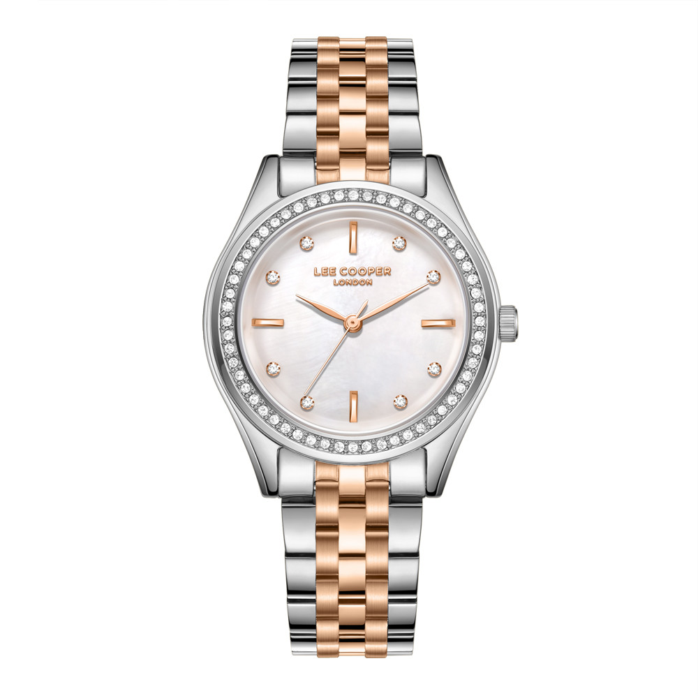 Стилен дамски часовник Lee Cooper от колекцията Elegance. Моделът е с декорация от нежни кристали по безела и дисплея. Корпус изработен от супер метал. Верижка от неръждаема стомана. Диаметър на корпуса 33 мм. Аналогов дисплей в седефен цвят. Стъкло минерал-кристал. Задвижва се от кварцов механизъм. Водоустойчивост 3 ATM - допускат се леки пръски, не се препоръчва обилно мокрене.