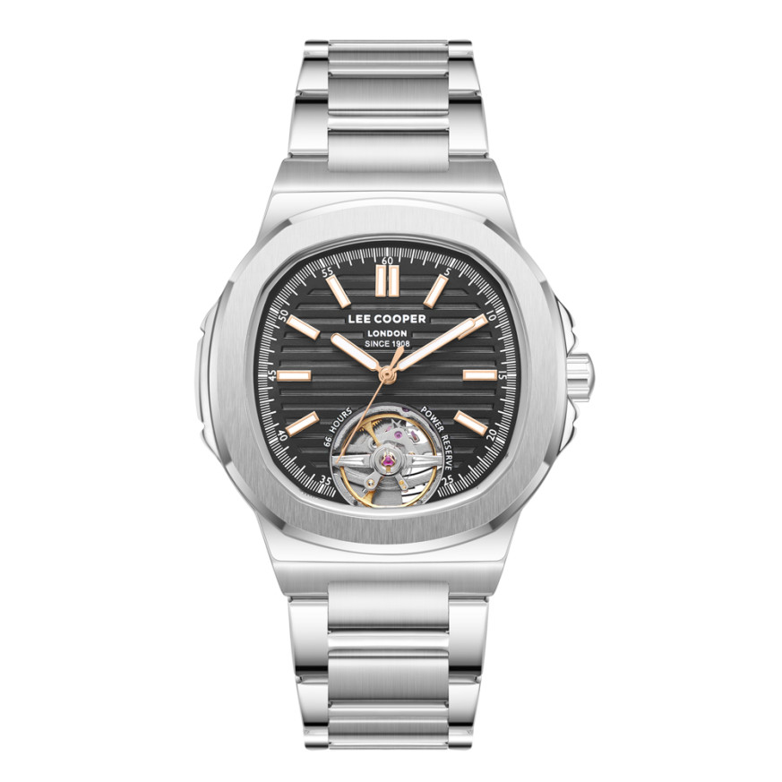 Мъжки часовник Lee Cooper с класичческа визия. Моделът е с корпус от супер метал и верижка от неръждаема стомана. Дисплеят е аналогов с видим баланс. Диаметър на корпуса 42 мм. Стъклото е минерал-кристал. Часовникът се задвижва от автоматичен механизъм G3251. Водоустойчивост 3 ATM - допускат се леки пръски, не се препоръчва обилно мокрене.
