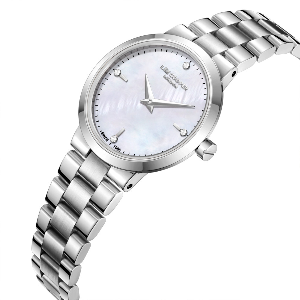 Класически модел дамски часовник Lee Cooper със стилна визия. Корпус изработен от супер метал. Верижка от неръждаема стомана. Аналогов дисплей в красив седефен цвят с декорация от нежни кристали. Стъкло минерал-кристал. Диаметър на корпуса 30 мм. Задвижва се от кварцов механизъм. Водоустойчивост 3 ATM - допускат се леки пръски, не се препоръчва обилно мокрене.