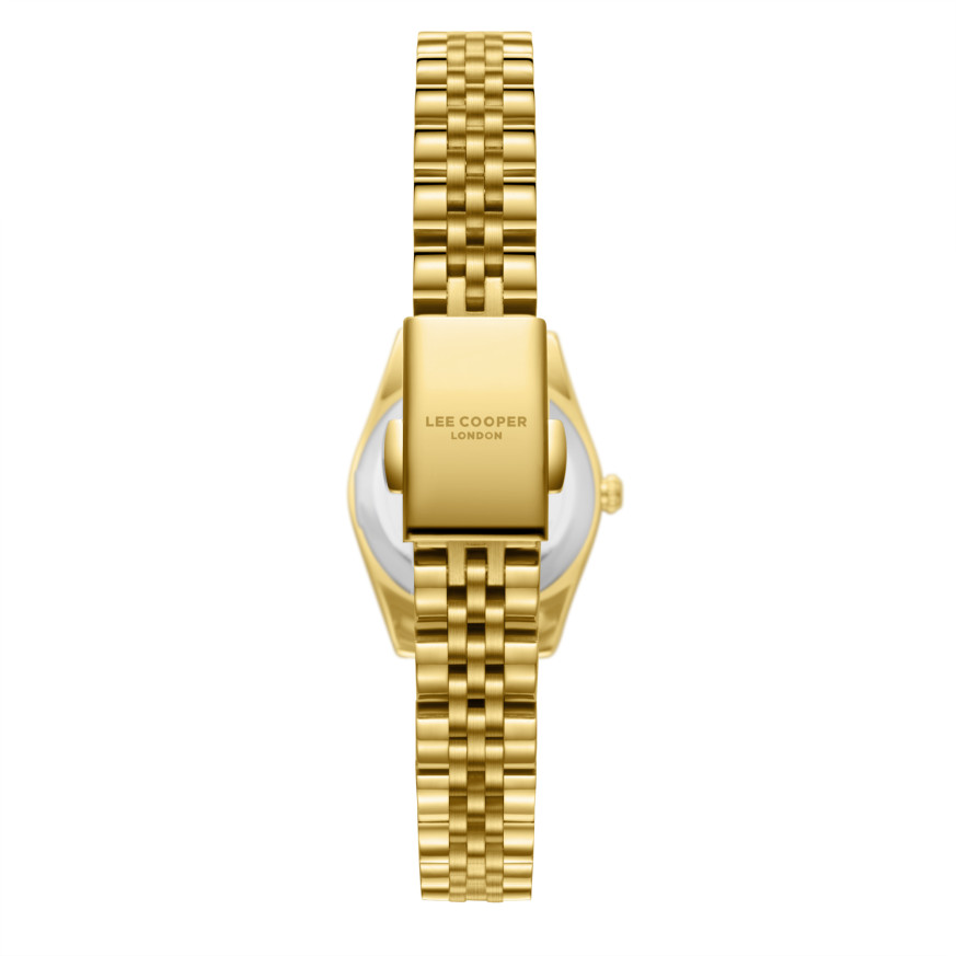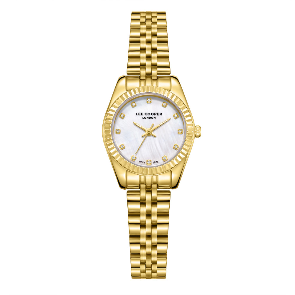 Елегантен дамски часовник Lee Cooper от колекцията Elegance. Моделът е с корпус от супер метал и верижка от неръждаема стомана. Дисплеят е аналогов в красив седефен цвят с дeкорация от нежни кристали. Диаметър на корпуса 25 мм. Стъклото е минерал-кристал. Часовникът се задвижва от кварцов механизъм. Водоустойчивост 3 ATM - допускат се леки пръски, не се препоръчва обилно мокрене.