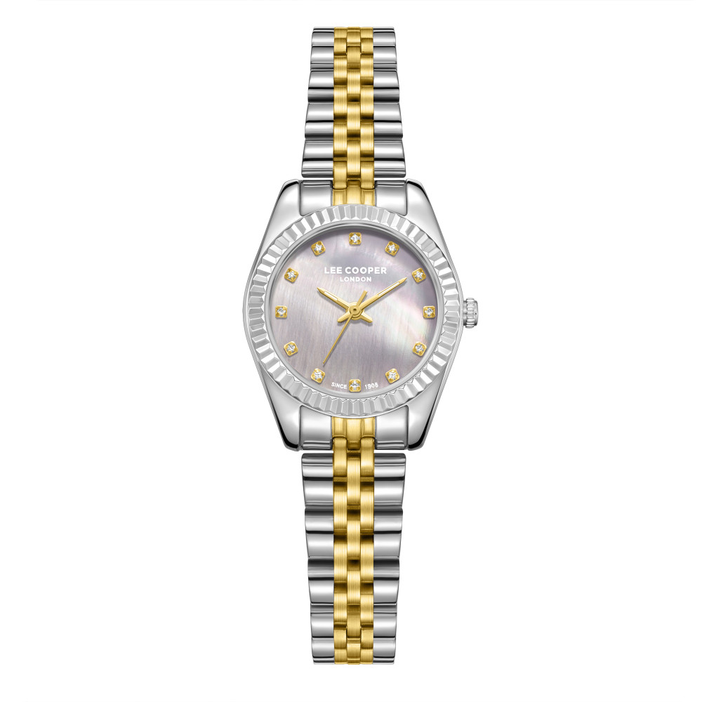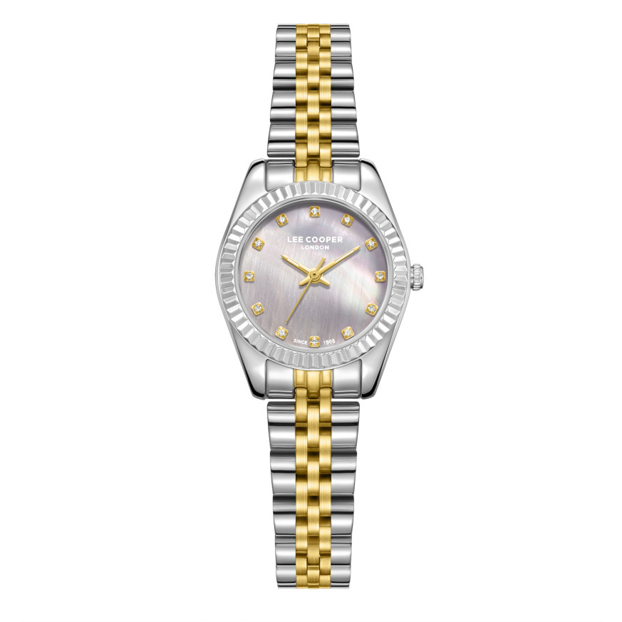 Елегантен дамски часовник Lee Cooper от колекцията Elegance. Моделът е с корпус от супер метал и верижка от неръждаема стомана. Дисплеят е аналогов в красив седефен цвят с дeкорация от нежни кристали. Диаметър на корпуса 25 мм. Стъклото е минерал-кристал. Часовникът се задвижва от кварцов механизъм. Водоустойчивост 3 ATM - допускат се леки пръски, не се препоръчва обилно мокрене.