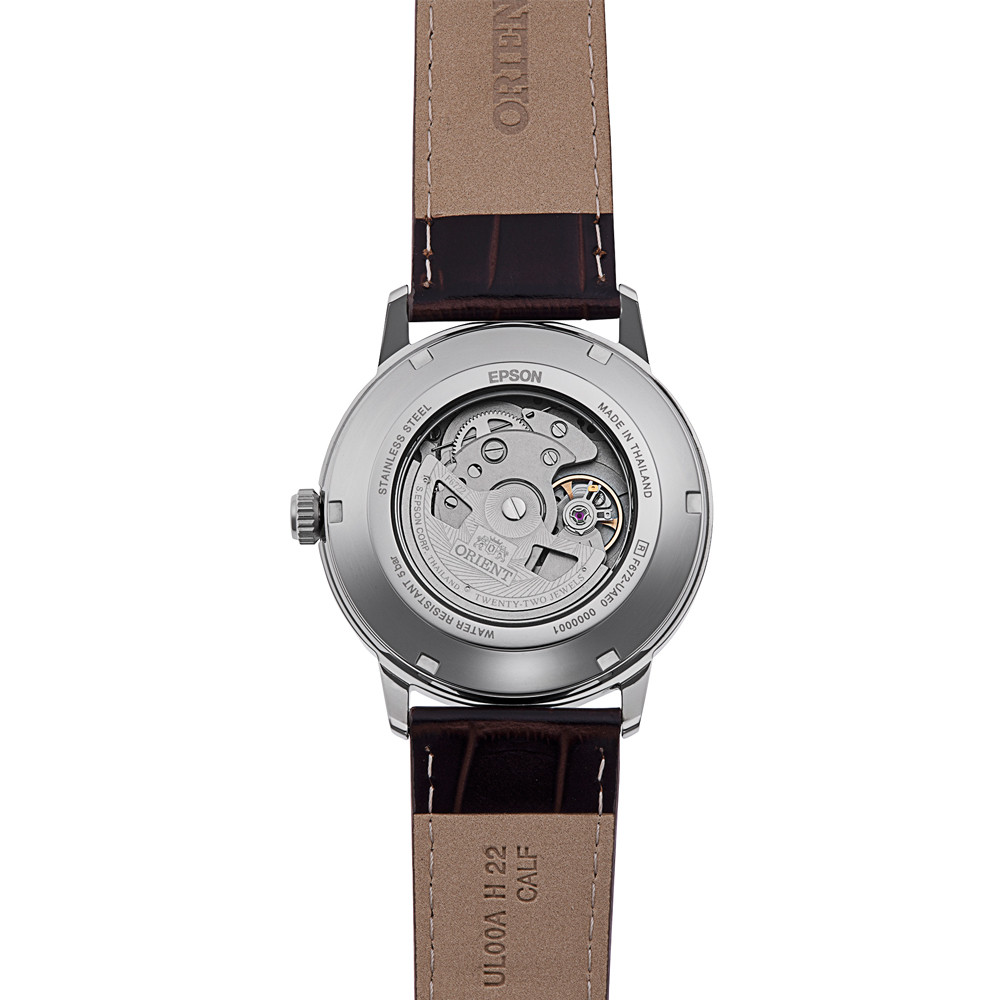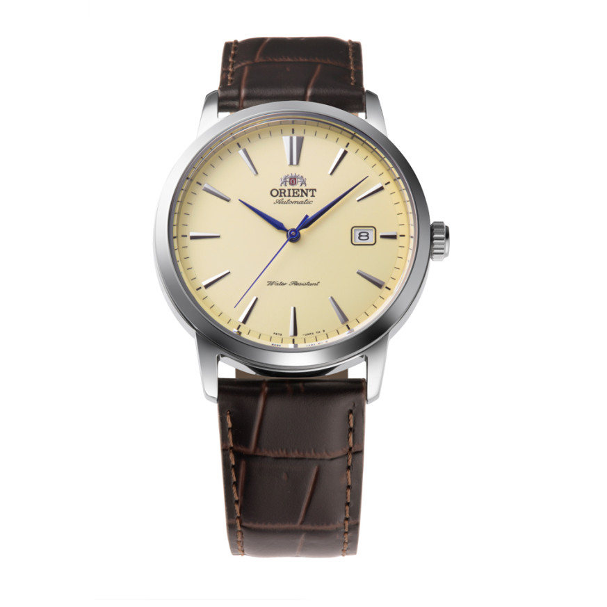 Класически модел мъжки часовник Orient със стилен дизайн от колекцията Contemporary. Корпус от неръждаема стомана. Кафява каишка от естествена кожа. Аналогов дисплей в бежов цвят с показател за дата. Сини стрелки и сребристи индекси. Стъкло минерал-кристал. Автоматичен японски механизъм Cal.F6722, който може да бъде наблюдаван през прозрачния гръб. Водоустойчивост 5 ATM - допускат се леки пръски и взимане на душ, не се препоръчва обилно мокрене.