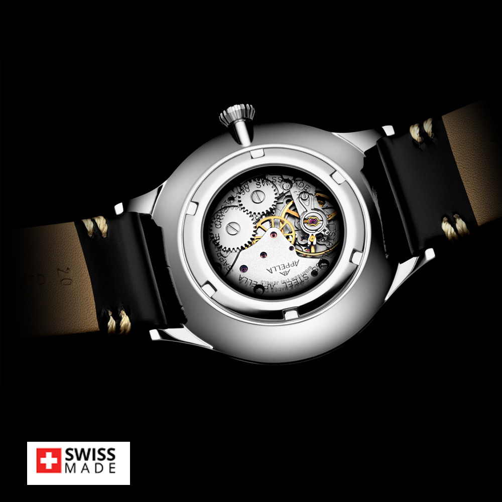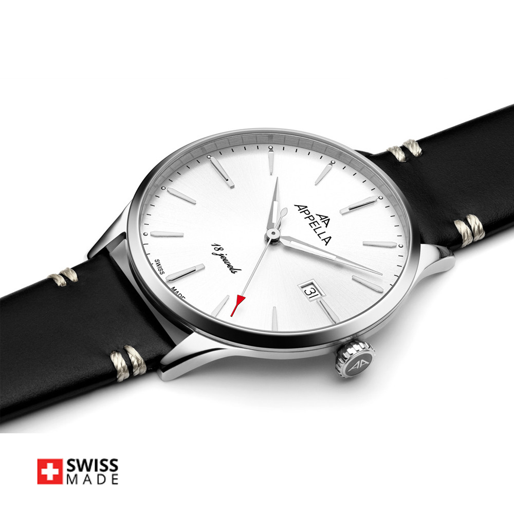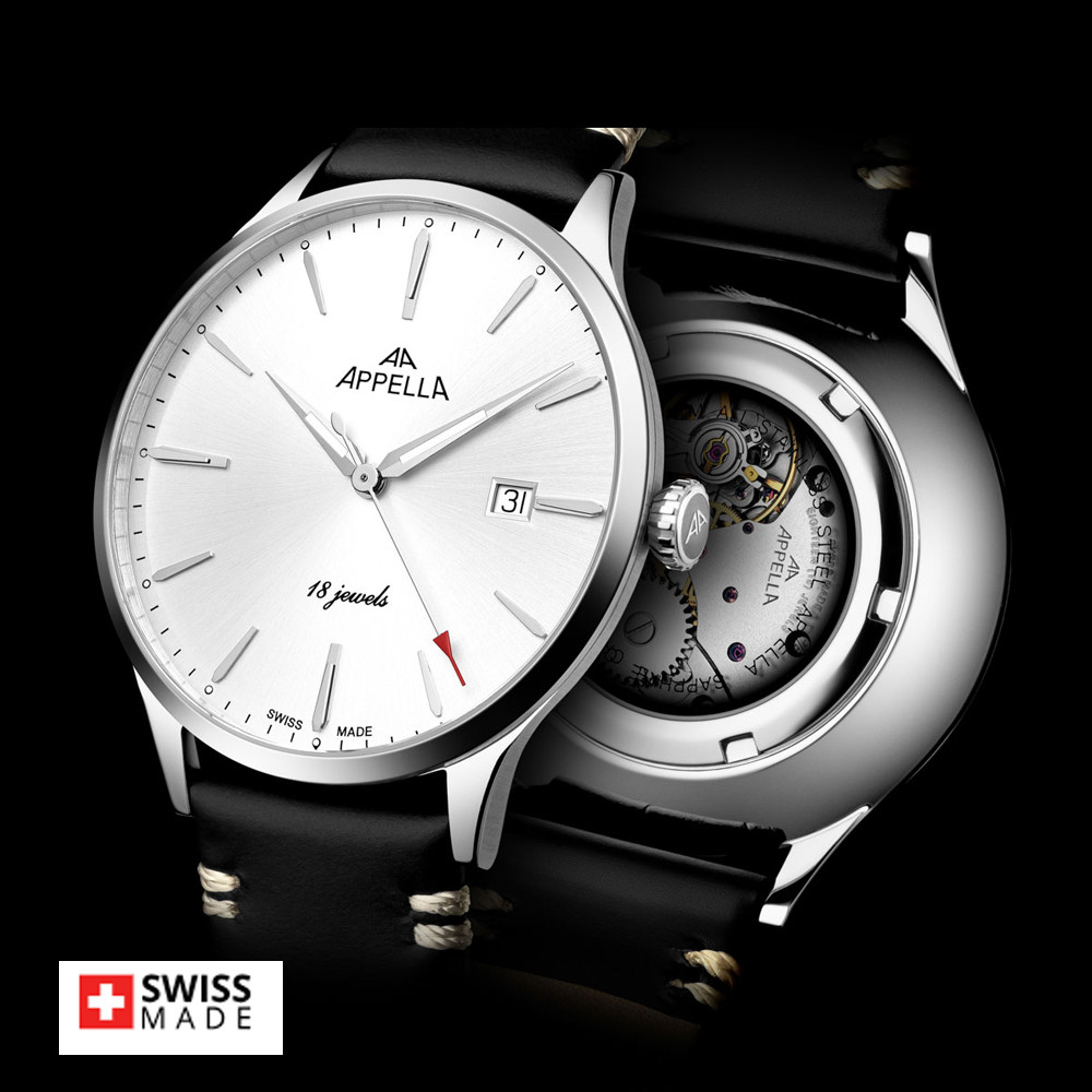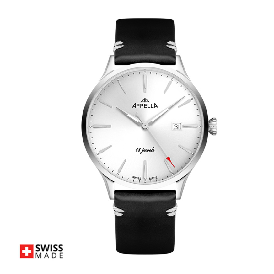 Елегантен мъжки часовник Appella L90.5213M. Корпусът е изработен от неръждаема стомана и е с диаметър 41 мм и дебелина 9 мм. Каишката е от естествена кожа. Аналогов дисплей в сребрист цвят с показател за дата. Стъклото е  сапфир-кристал. Моделът е с прозрачен заден капак, през който може да се наблюдава механизма. Часовникът се задвижва от механизъм Sellita SW 210 Swiss Made. Водоустойчивост 3 ATM - допускат се леки пръски, не се препоръчва обилно мокрене.