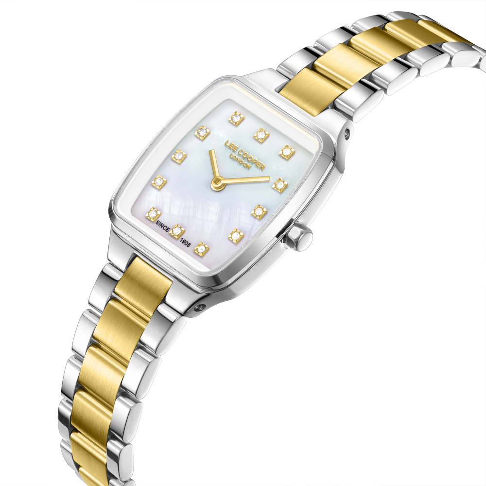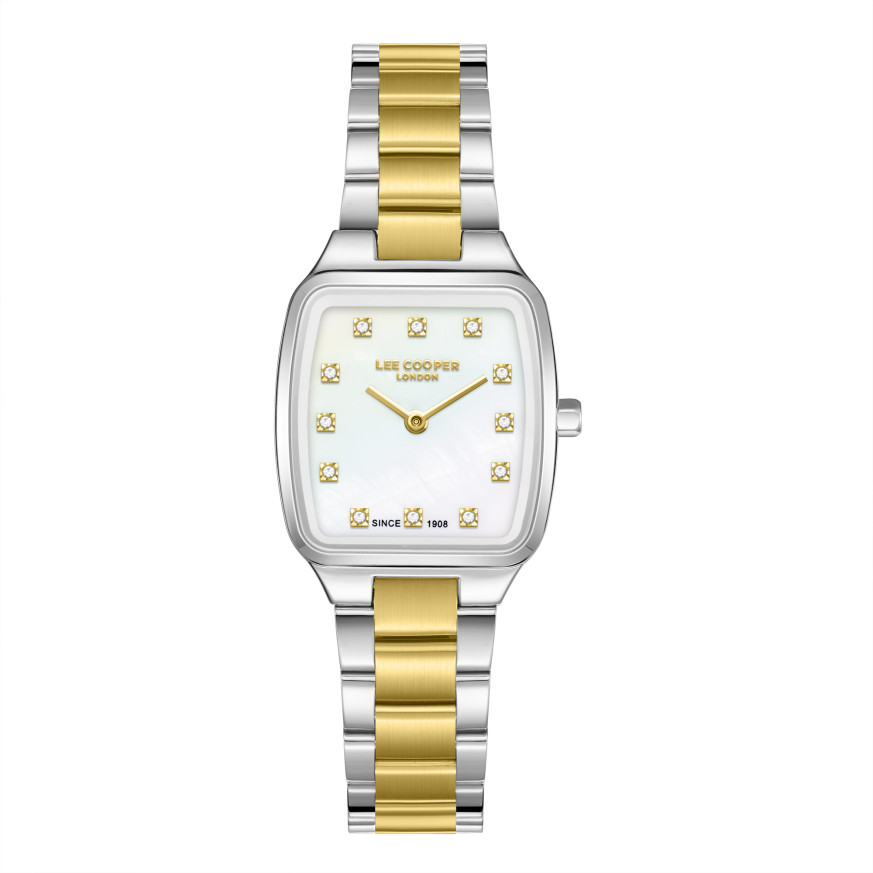 Стилен дамски часовник Lee Cooper с красив дизайн от колекцията Elegance. Моделът е с корпус изработен от супер метал (специална сплав, създадена от марката)  и верижка от неръждаема стомана. Дисплеят е аналогов в нежен седефен цвят с декорация от бляскави кристали по часовите маркери. Стъклото е минерал-кристал. Часовникът се задвижва от кварцов механизъм. Водоустойчивост 3 ATM - допускат се леки пръски, не се препоръчва обилно мокрене.