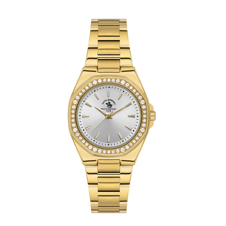 Красив дамски часовник от колекцията Unique. Моделът е с корпус и верижка от неръждаема стомана. Декорация от нежни кристали по безела. Аналогов дисплей в сребрист цвят със златисти стрелки и индекси. Диаметър на корпуса 30 мм. Стъкло минерал-кристал. Часовникът се задвижва от кварцов механизъм. Водоустойчивост 5 ATM - допускат се леки пръски и взимане на душ, не се препоръчва обилно мокрене.