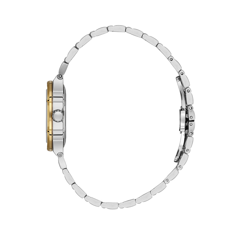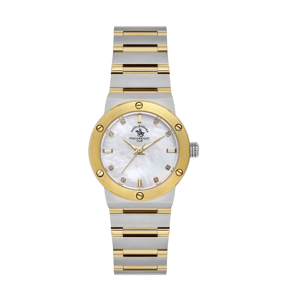 Красив дамски часовник с модерен дизайн от колекцията Unique. Моделът е с корпус и верижка от неръждаема стомана. Аналогов дисплей в нежен седефен цвят с декорация от кристали. Диаметър на корпуса 29 мм. Стъкло минерал-кристал. Задвижва се от кварцов механизъм. Водоустойчивост 5 ATM - допускат се леки пръски и взимане на душ, не се препоръчва обилно мокрене.
