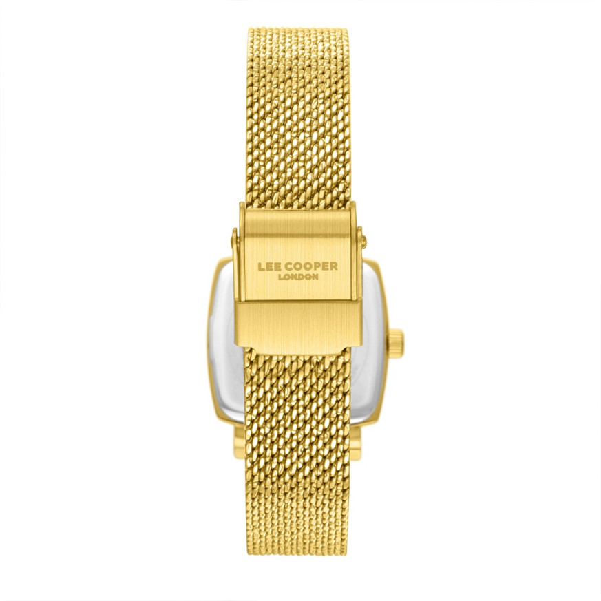Дамски часовник Lee Cooper с класически дизайн от колекцията Elegance. Корпус изработен от супер метал (специална сплав, създадена от марката)  в комбинация с верижка от неръждаема стомана. Аналогов дисплей в зелен цвят със златисти детайли. Стъкло минерал-кристал. Часовникът се задвижва от кварцов механизъм. Водоустойчивост 3 ATM - допускат се леки пръски, не се препоръчва обилно мокрене.