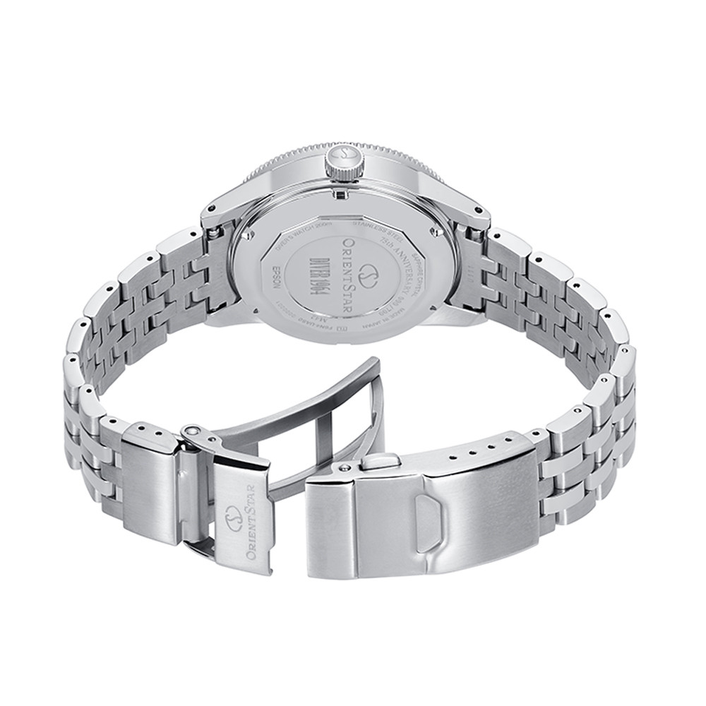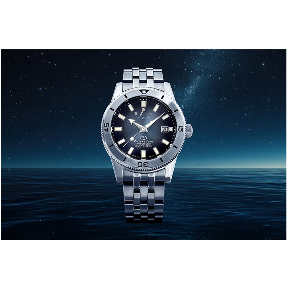 Часовник Orient Star RE-AU0503N M42 Diver 1964 е лимитиран модел, създаден по повод 75-годишнината на марката, който съчетава японско часовникарско майсторство и вдъхновение от дълбините на океана. Уникалният циферблат с градиент от синьо-сиво към тъмни нюанси пресъздава прехода между нощното небе и морските дълбини, създавайки впечатляваща визуална дълбочина. Моделът разполага с автоматичен механизъм, индикатор за резерв на енергия и дата, като съчетава функционалност и изключителен дизайн. Сапфир-кристалът с антирефлексно покритие и водоустойчивост до 200 метра (ISO 6425) го правят истински професионален дайвър часовник.