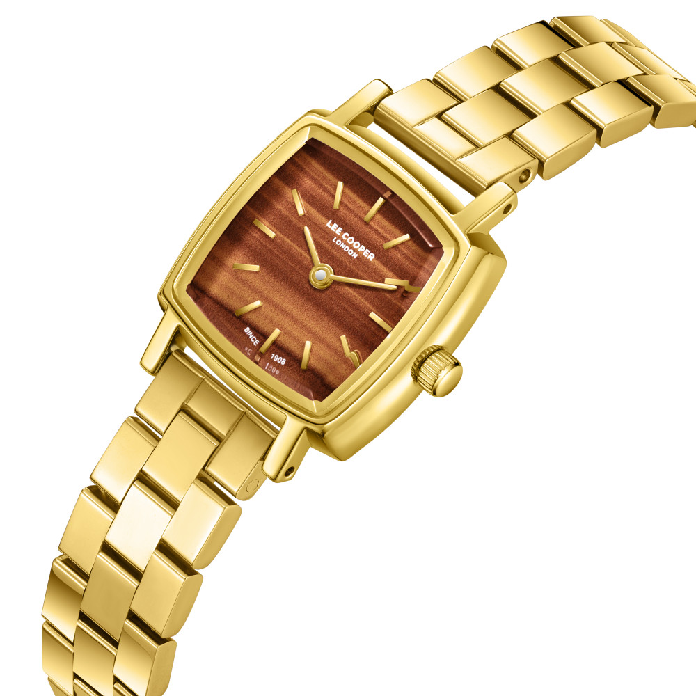 Класически модел дамски часовник Lee Cooper от колекцията Elegance. Корпус изработен от супер метал (специална сплав, създадена от марката)  в комбинация с верижка от неръждаема стомана. Аналогов дисплей в кафяв цвят със златисти детайли. Стъкло минерал-кристал. Часовникът се задвижва от кварцов механизъм. Водоустойчивост 3 ATM - допускат се леки пръски, не се препоръчва обилно мокрене.