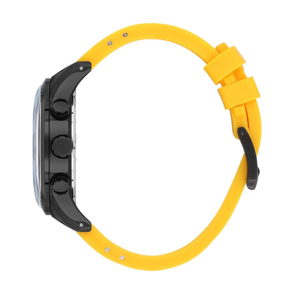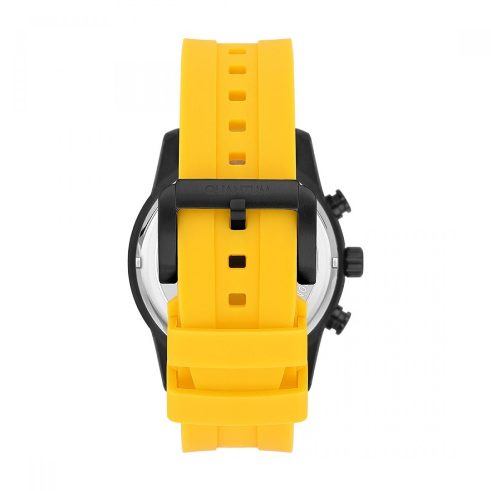 Мъжки часовник Quantum със спортен дизайн от колекцията Adrenaline. Черен мултифункционален дисплей с детайли в сребрист и жълт цвят. Луминесцентно покритие върху стрелките. Стъкло минерал-кристал. Корпус изработен от неръждаема стомана. Жълта силиконова каишка с черни акценти. Диаметър на корпуса 47 мм. Задвижва се от кварцов механизъм. Водоустойчивост 10 ATM - позволява мокрене, къпане и плуване във водни басейни.