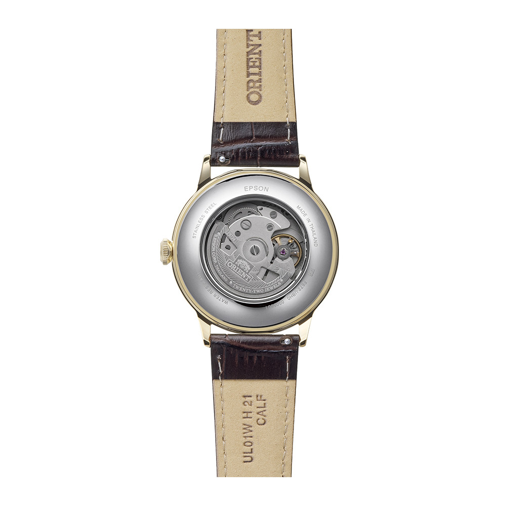 Часовник ORIENT RA-AC0028S е изискан класически модел, който комбинира традиционен дизайн и японска механична прецизност. Белият циферблат със златисти стрелки и индекси придава топъл и елегантен характер, а дискретният прозорец за дата осигурява практичност в ежедневието. Корпусът от благородна стомана с диаметър 40.5 мм е балансиран и удобен за носене, а кафявата каишка от естествена кожа допълва класическата визия. Автоматичният механизъм Cal.F6724 може да бъде наблюдаван през прозрачния заден капак – детайл, който подчертава автентичната механична изработка на ORIENT.