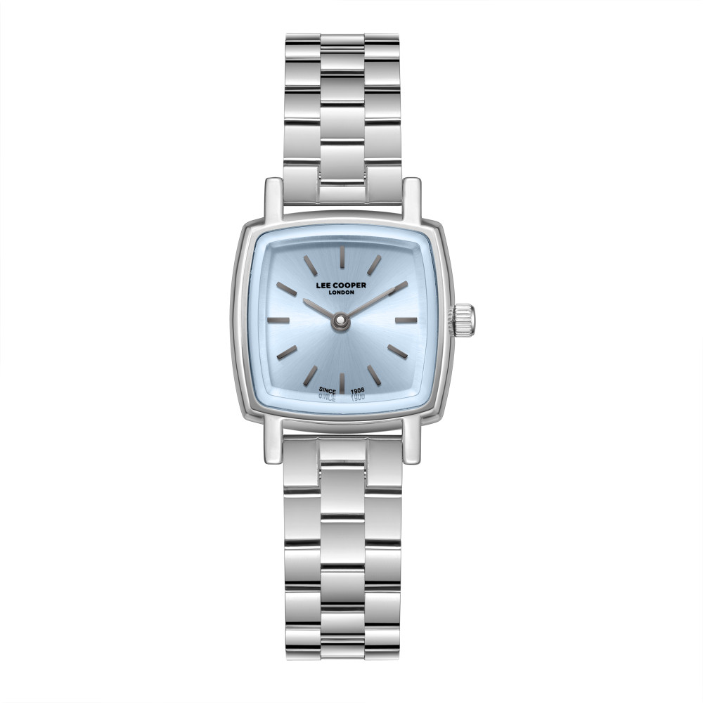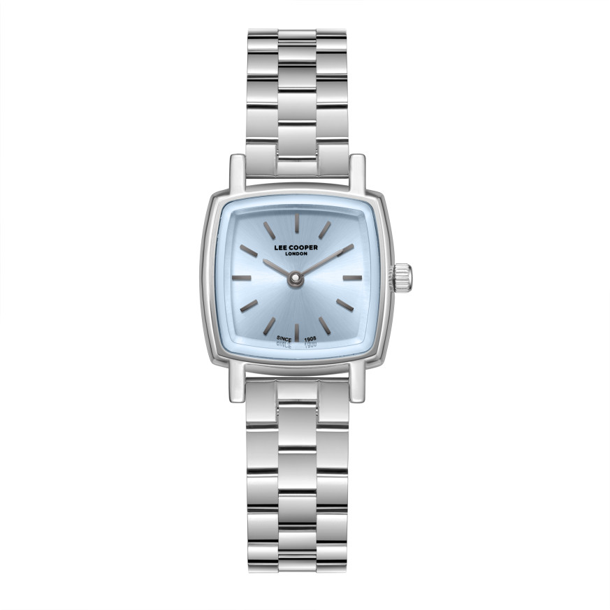 Класически модел дамски часовник Lee Cooper от колекцията Elegance. Корпус изработен от супер метал (специална сплав, създадена от марката)  в комбинация с верижка от неръждаема стомана. Аналогов дисплей в нежен син цвят със сребристи детайли. Стъкло минерал-кристал. Часовникът се задвижва от кварцов механизъм. Водоустойчивост 3 ATM - допускат се леки пръски, не се препоръчва обилно мокрене.