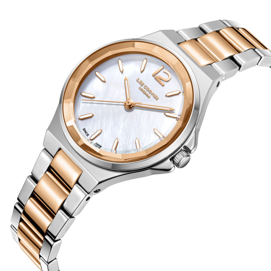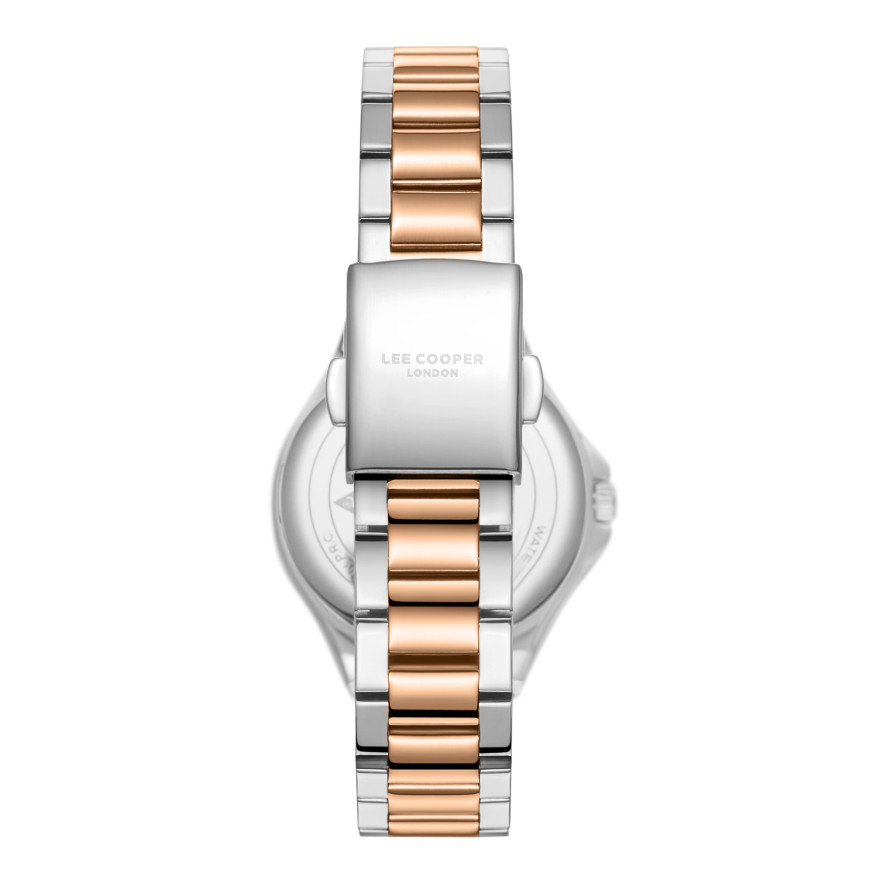 Дамски часовник Lee Cooper с класическа визия от колекцията Elegance. Корпус изработен от супер метал - специална сплав, създадена от марката. Верижка от неръждаема стомана. Аналогов дисплей в нежен седефен цвят. Стъкло минерал-кристал. Диаметър на корпуса 32 мм.  Часовникът се задвижва от кварцов механизъм. Водоустойчивост 3 ATM - допускат се леки пръски, не се препоръчва обилно мокрене.