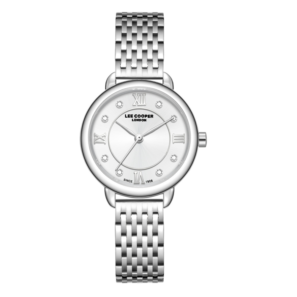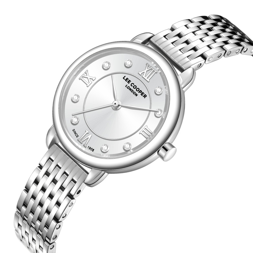 Красив дамски часовник Lee Cooper със стилна визия от колекцията Elegance. Корпусът е изработен от супер метал - специална сплав, създадена от марката. Верижката е от неръждаема стомана. Дисплеят е аналогов в сив цвят с декорация от бляскави кристали. Стъклото е минерал-кристал. Диаметър на корпуса 31 мм.  Часовникът се задвижва от кварцов механизъм. Водоустойчивост 3 ATM - допускат се леки пръски, не се препоръчва обилно мокрене.