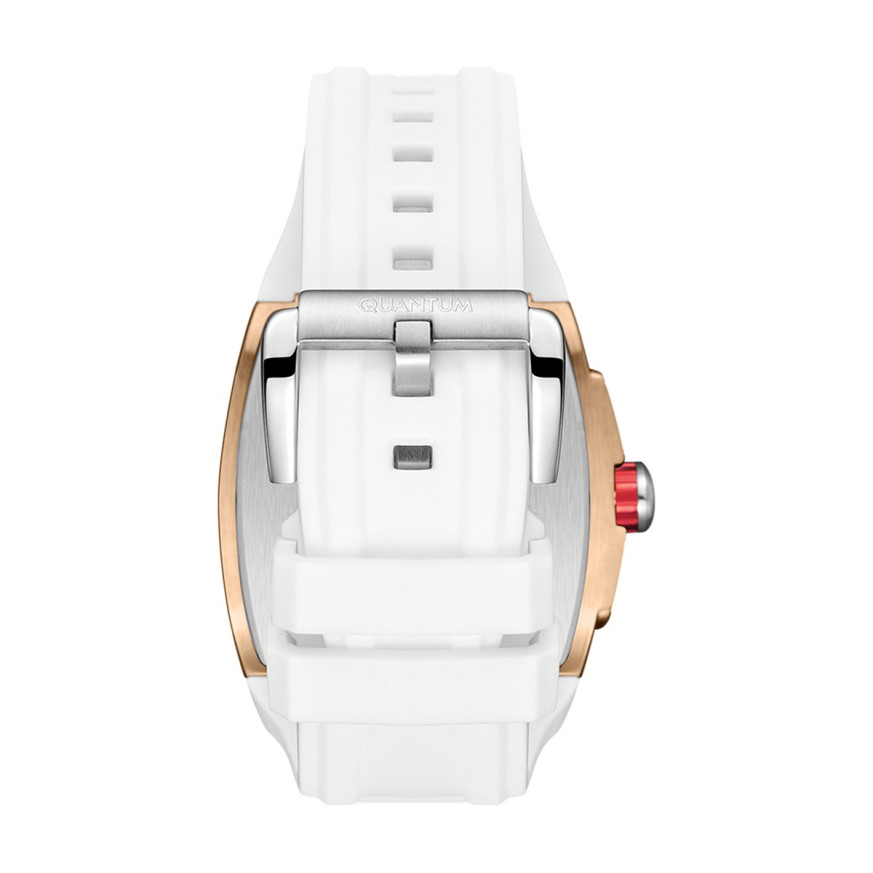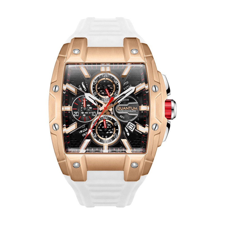 Впечатляващ модел мъжки часовник Quantum от колекцията Hunter. Дисплей хронограф с луминесцентно покритие върху стрелките и индексите. Стъкло минерал-кристал с антирефлексно покритие. Корпус от неръждаема стомана в комбинация със силиконова каишка. Задвижва се от кварцов механизъм. Водоустойчивост 10 ATM - позволява мокрене, къпане и плуване във водни басейни.