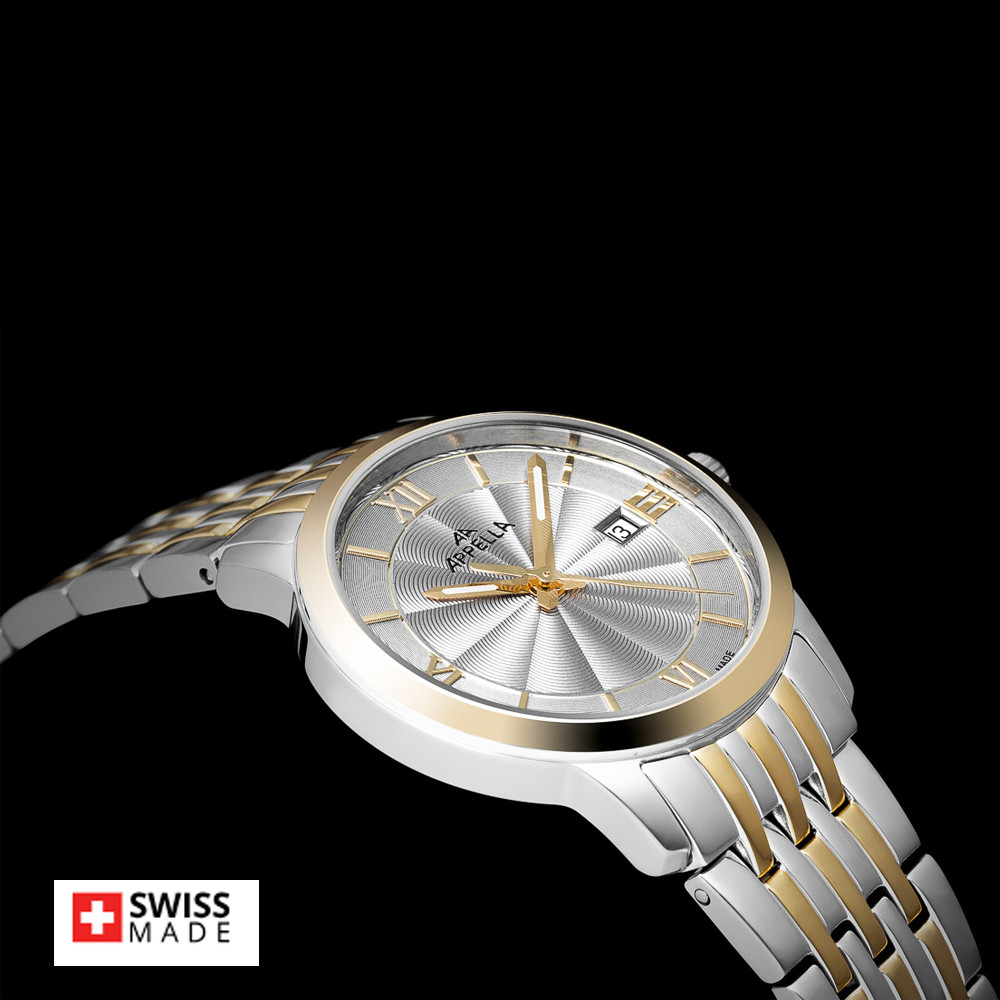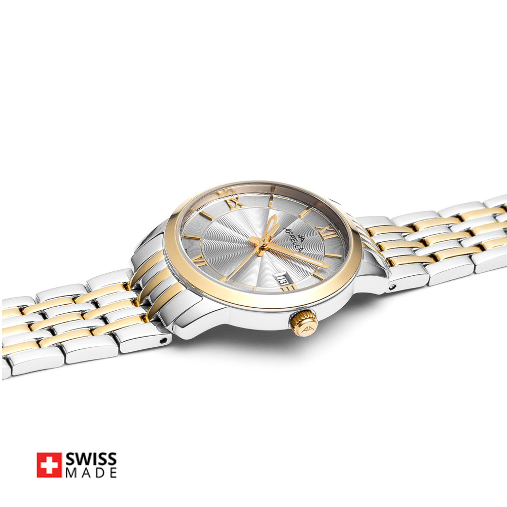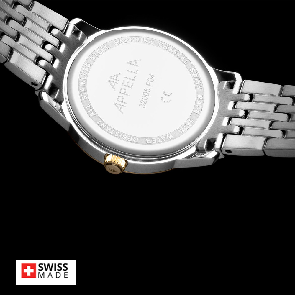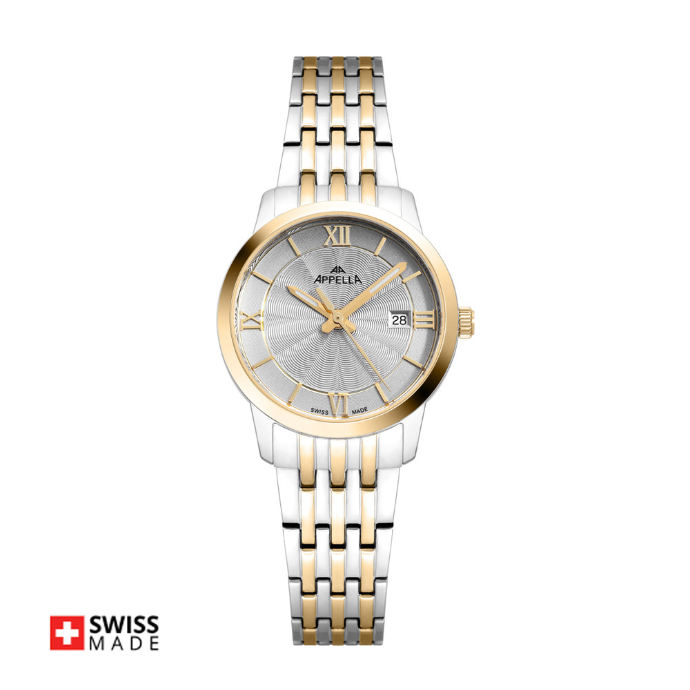 Дамски часовник Appella L32005.2167Q с класически дизайн. Аналогов дисплей в сив цвят с индикатор за дата. Корпус и верижка изработени от неръждаема стомана. Стъкло сапфир-кристал. Задвижва се от кварцов механизъм ETA F04 Swiss Made. Диаметър на корпуса 30 мм. Водоустойчивост 5 ATM - допускат се леки пръски и взимане на душ, не се препоръчва обилно мокрене.