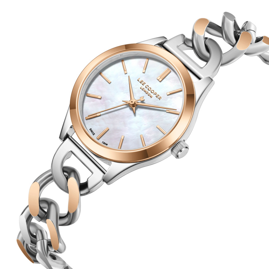 Стилен дамски часовник Lee Cooper от колекцията Elegance. Корпус изработен от супер метал - специална сплав, създадена от марката. Верижка с интересен дизайн от неръждаема стомана. Аналогов дисплей в нежен седефен цвят. Стъкло минерал-кристал. Диаметър на корпуса 30 мм. Часовникът се задвижва от кварцов механизъм. Водоустойчивост 3 ATM - допускат се леки пръски, не се препоръчва обилно мокрене.