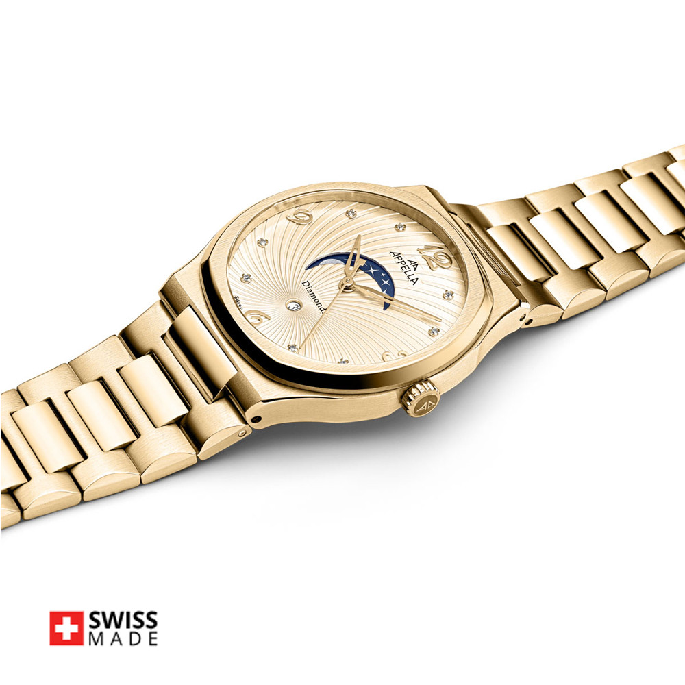 Дамски часовник Appella L32006.1171DQS е отличен избор за жени, които ценят елегантността и блясъка. Стоманения корпус в златист цвят хармонизира с красивия златист циферблат, украсен с диаманти, придавайки му уникален щрих. Моделът е с показател за дата и лунна фаза. Корпусът и верижката са  изработени от неръждаема стомана. Стъклото е сапфир-кристал. Задвижва се от кварцов механизъм RONDA 788 Swiss Made. Диаметър на корпуса 33 мм. Водоустойчивост 5 ATM - допускат се леки пръски и взимане на душ, не се препоръчва обилно мокрене.
