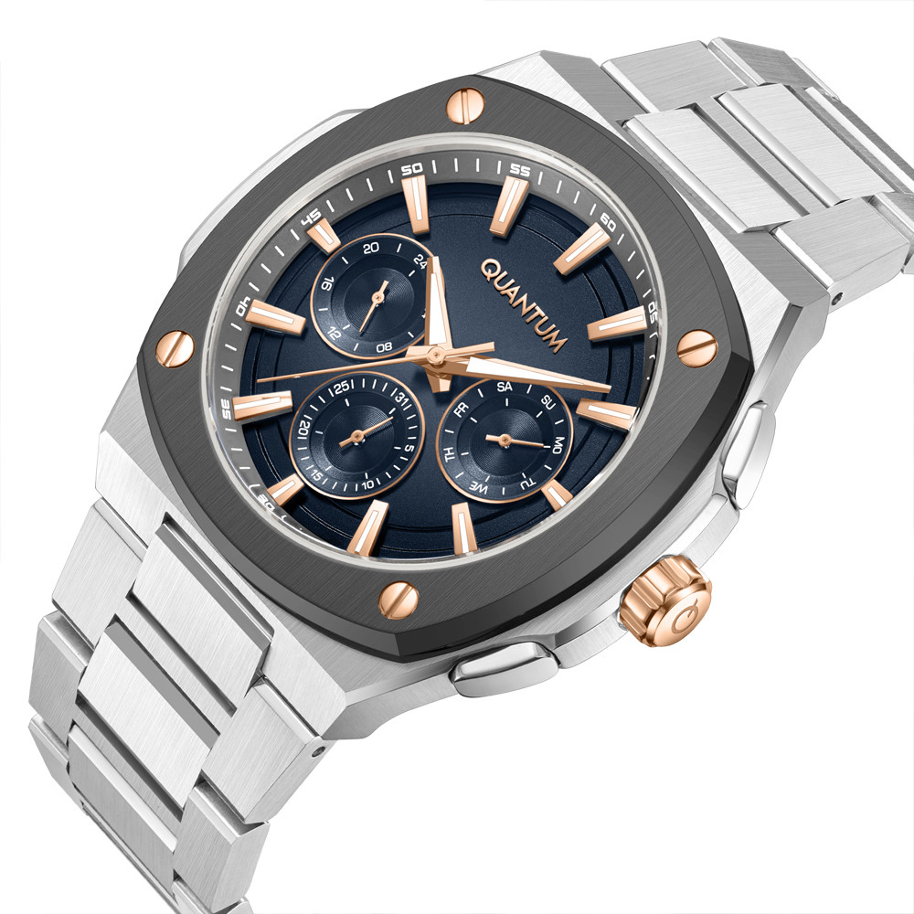 Мъжки часовник Quantum със спортно-ежедневен дизайн от колекцията Adrenaline. Тъмносин мултифункционален дисплей с детайли в цвят розово злато. Луминесцентно покритие върху стрелките и индексите. Стъкло минерал-кристал. Корпус и верижка изработени от неръждаема стомана. Диаметър на корпуса 44 мм. Задвижва се от кварцов механизъм с калибър VX9J. Водоустойчивост 10 ATM - позволява мокрене, къпане и плуване във водни басейни.