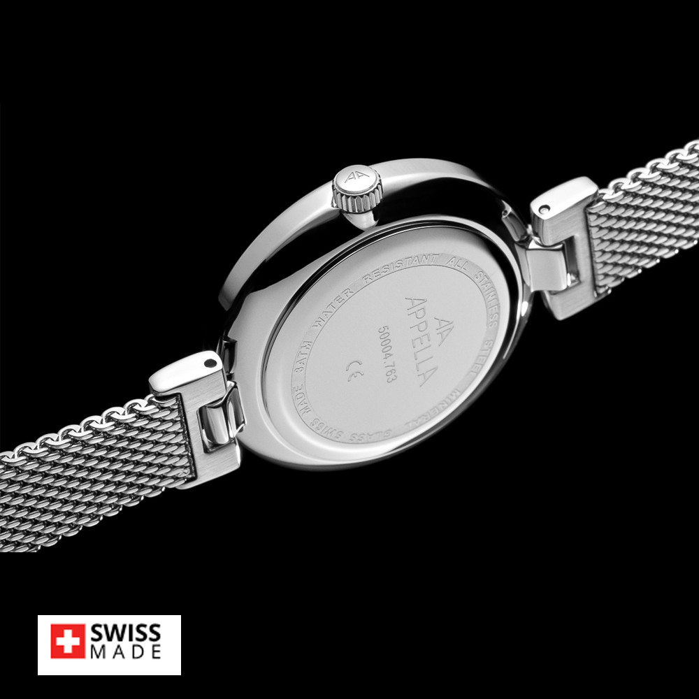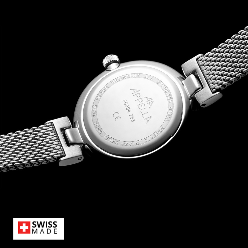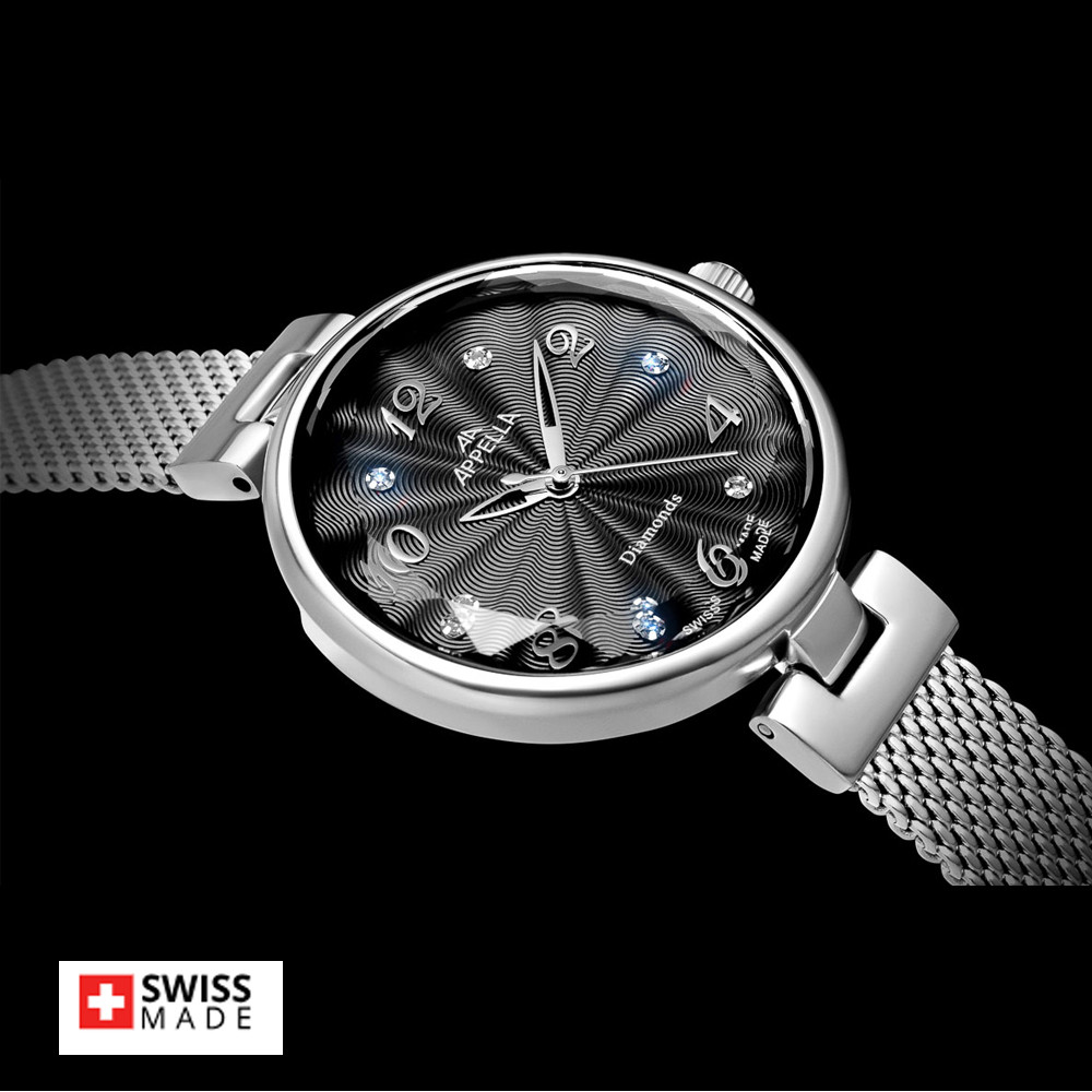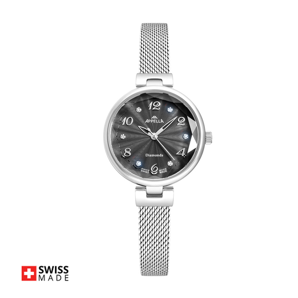 Стилен дамски часовник Appella L50004.1171DQ с нежен дизайн. Циферблат в тъмносив цвят, украсен със 6 диаманта. Корпусът и тънка верижка изработени от неръждаема стомана. Стъкло минерал-кристал. Задвижва се от кварцов механизъм RONDA 763 Swiss Made. Диаметър на корпуса 30 мм. Водоустойчивост 3 ATM - допускат се леки пръски, не се препоръчва обилно мокрене.