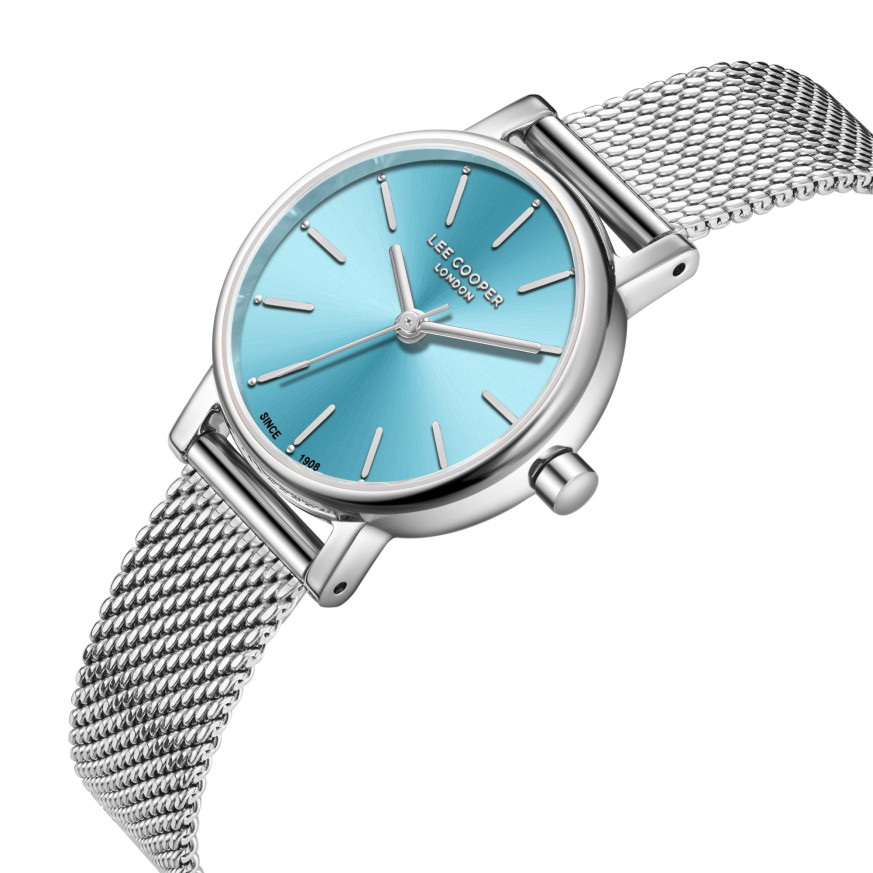 Дамски часовник Lee Cooper с класическа визия от колекцията Elegance.Моделът е с корпус изработен от супер метал (специална сплав, създадена от Lee Cooper) и верижка от неръждаема стомана. Аналогов дисплей в нежен син цвят със сребристи стрелки и индекси. Стъкло минерал-кристал. Диаметър на корпуса 26 мм. Часовникът се задвижва от кварцов механизъм. Водоустойчивост 3 ATM - допускат се леки пръски, не се препоръчва обилно мокрене.