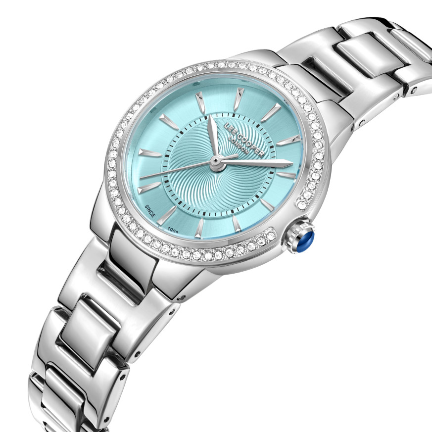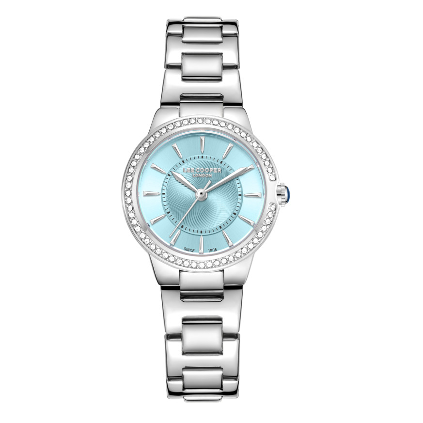 Стилен дамски часовник Lee Cooper от колекцията Elegance. Корпус изработен от супер метал (специална сплав, създадена от Lee Cooper). Верижка от неръждаема стомана. Аналогов дисплей в нежен син цвят със сребристи детайли. Декорация от бляскави кристали по безела. Стъкло минерал-кристал. Диаметър на корпуса 30 мм. Часовникът се задвижва от кварцов механизъм. Водоустойчивост 3 ATM - допускат се леки пръски, не се препоръчва обилно мокрене.