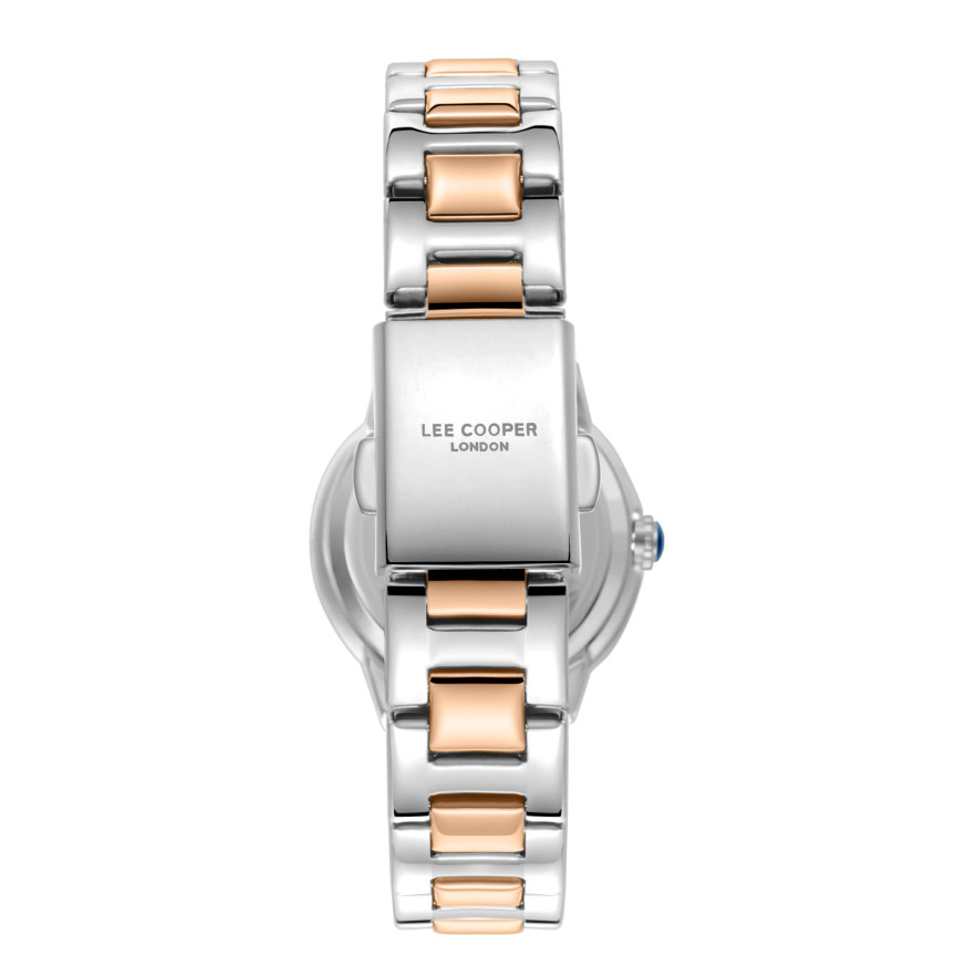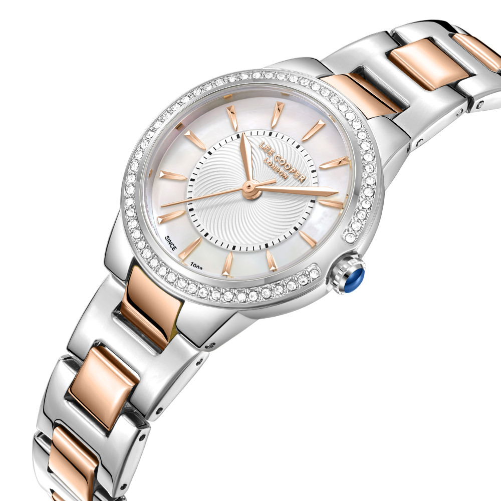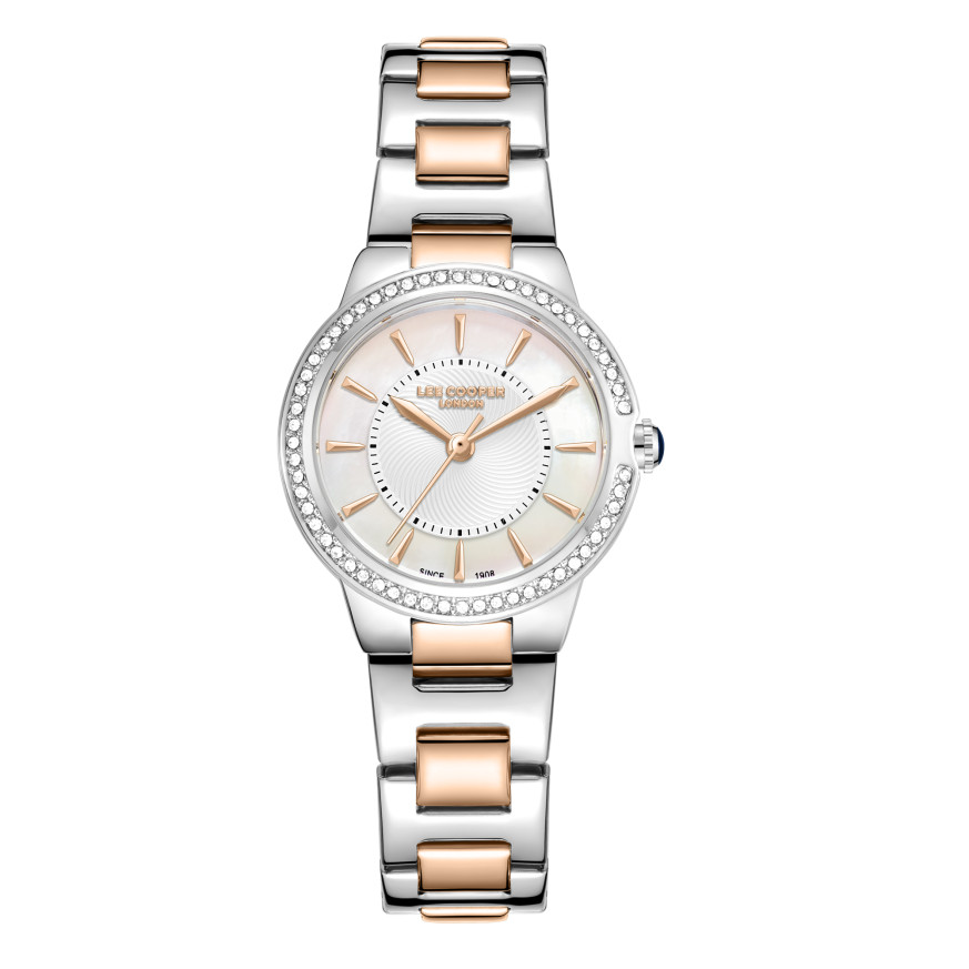 Стилен дамски часовник Lee Cooper от колекцията Elegance. Корпус изработен от супер метал (специална сплав, създадена от Lee Cooper). Верижка от неръждаема стомана. Моделът е с аналогов дисплей в нежен седефен цвят и декорация от бляскави кристали по безела. Стъкло минерал-кристал. Диаметър на корпуса 30 мм. Часовникът се задвижва от кварцов механизъм. Водоустойчивост 3 ATM - допускат се леки пръски, не се препоръчва обилно мокрене.