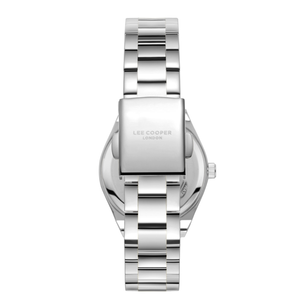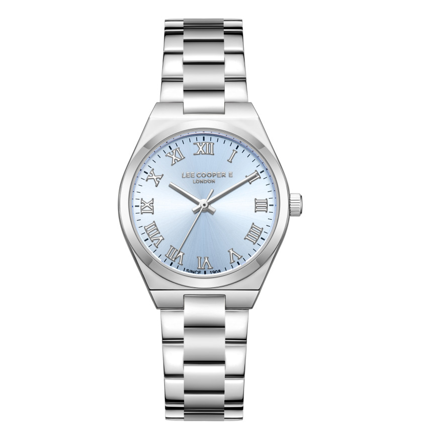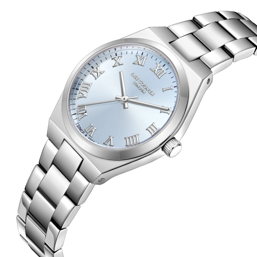 Класически модел дамски часовник Lee Cooper от колекцията Elegance. Корпус изработен от супер метал (специална сплав, създадена от Lee Cooper). Верижка от неръждаема стомана. Аналогов дисплей в син цвят със сребристи детайли. Стъкло минерал-кристал. Диаметър на корпуса 30 мм. Часовникът се задвижва от кварцов механизъм. Водоустойчивост 3 ATM - допускат се леки пръски, не се препоръчва обилно мокрене.