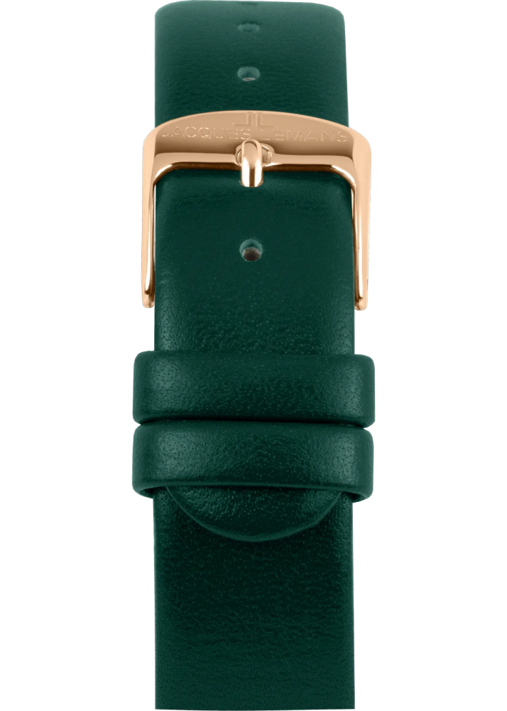 Jacques Lemans 1-2093K е дамски часовник, който се отличава с модерен цветови контраст и индивидуален стил. Зеленият циферблат в комбинация с розовите индекси и стрелки създава елегантна, но различна визия, която привлича внимание. Корпусът с розово IP покритие добавя усещане за фин лукс, а зелената кожена каишка завършва хармонично дизайна. Това е модел, който се откроява и подчертава личния стил, без да губи своята елегантност.