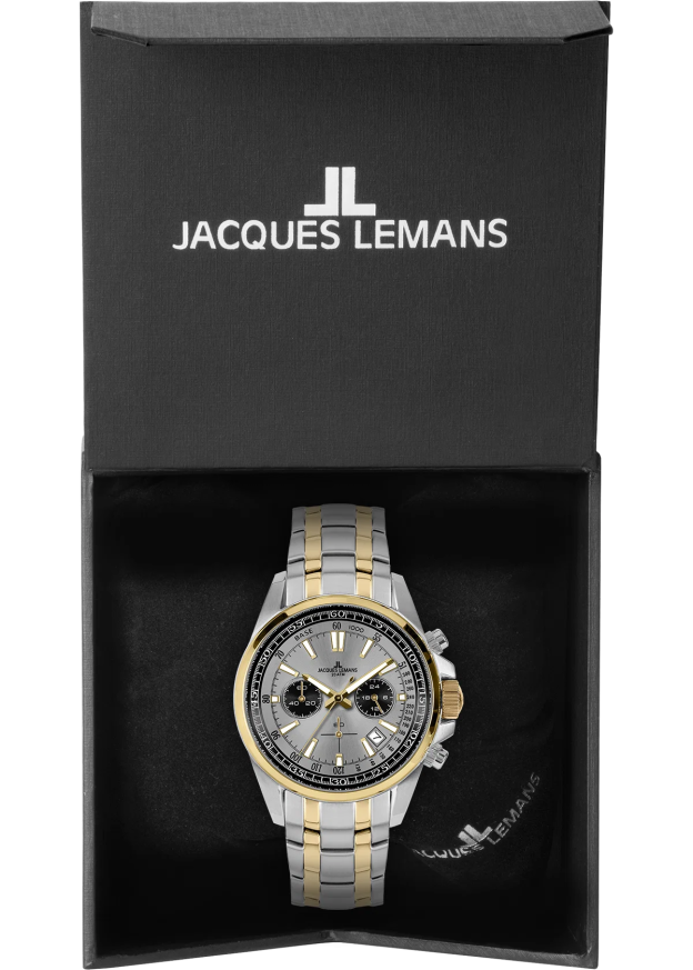 Часовник Jacques Lemans 1-2117ZM – Мъжки спортен хронограф със сив циферблат и биколорен корпус