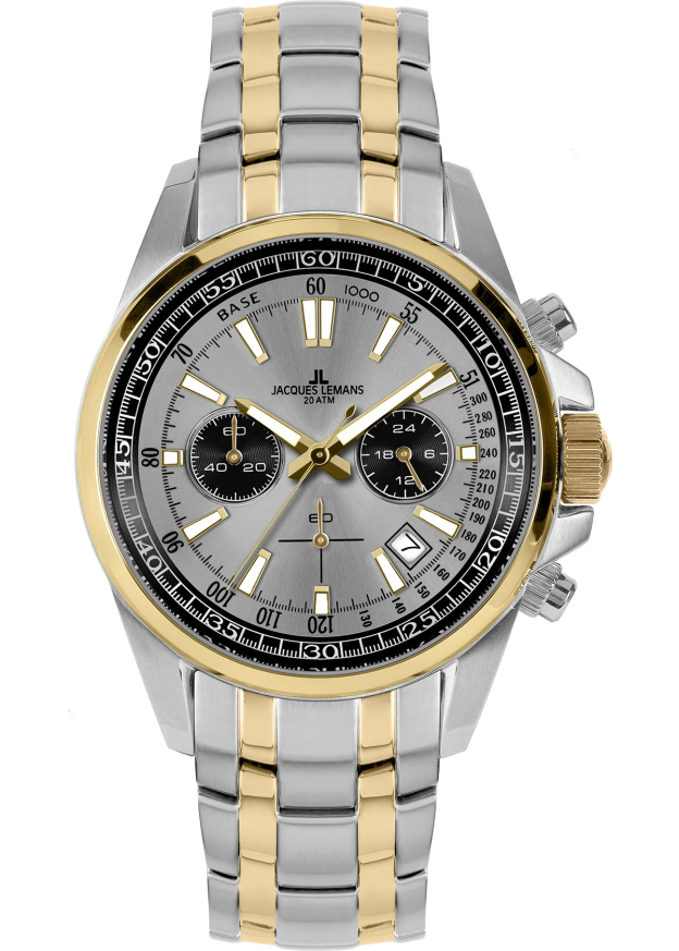 Jacques Lemans 1-2117ZM е мъжки спортен часовник с агресивна и модерна визия, съчетаваща сив циферблат с контрастни жълти акценти. Моделът предлага хронограф функция, 24-часов индикатор и тахиметър за прецизно измерване на скорост и време. Корпусът от благородна стомана с биколорно жълто IP покритие осигурява здравина и стил, а масивната стоманена верижка допълва спортния характер. С водоустойчивост до 20 ATM, този часовник е създаден за динамичен начин на живот.