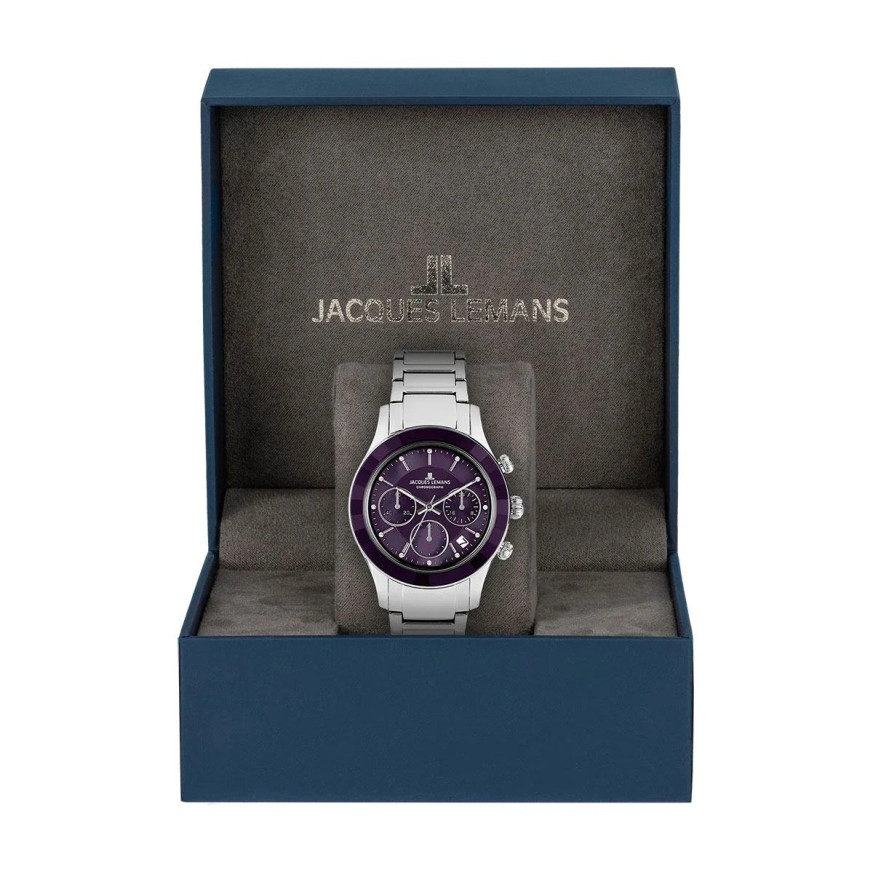 Часовник Jacques Lemans 1-2151M от колекция Venice съчетава модерен дизайн, спортна динамика и изискан блясък. Лилавият седефен циферблат придава дълбочина и елегантност, а фината инкрустация от кристали Swarovski над индексите добавя луксозен акцент. Моделът разполага с хронограф, дата и 24-часов формат, допълнени от луминесцентно покритие за по-добра видимост в тъмни условия. Корпусът и верижката от благородна стомана осигуряват устойчивост и комфорт, а минерал-кристалното стъкло предпазва от надраскване при ежедневна употреба.