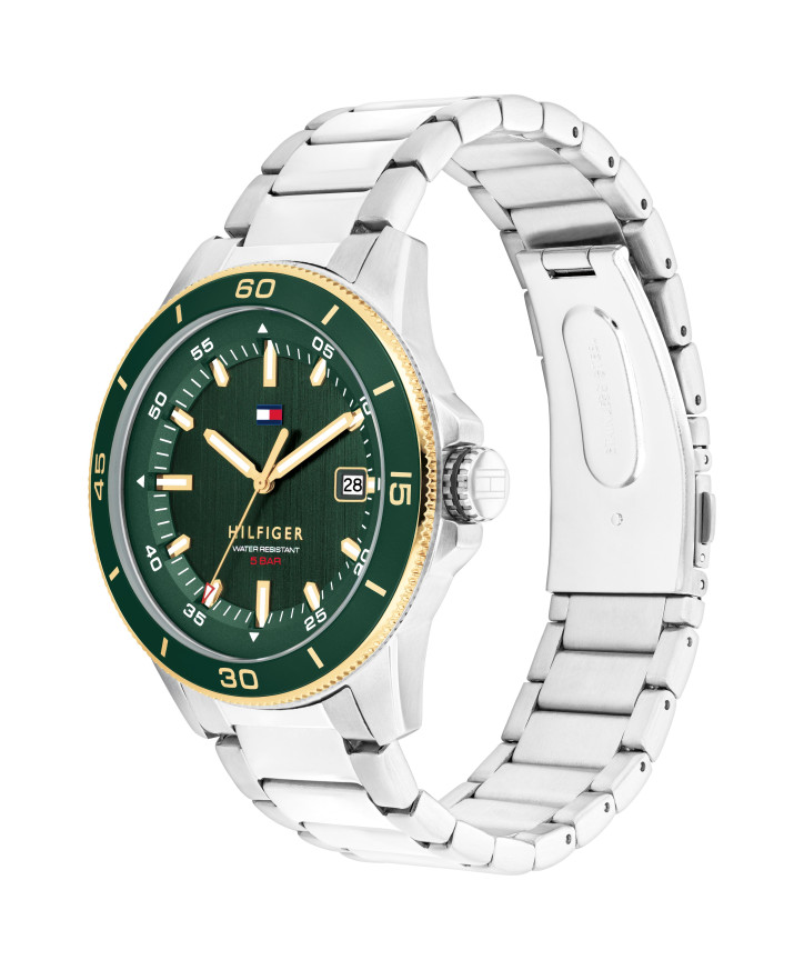 Часовник Tommy Hilfiger 1792230 комбинира спортна естетика и модерен стил в елегантен дизайн, подходящ за ежедневието. Корпусът и верижката от благородна стомана осигуряват устойчивост и комфорт, а зеленият циферблат в контраст със златистите стрелки и индекси създава отлична визуална дълбочина. Моделът предлага ясна индикация за дата, минерално стъкло и водоустойчивост 5 ATM, което го прави практичен избор за динамичен градски ритъм.