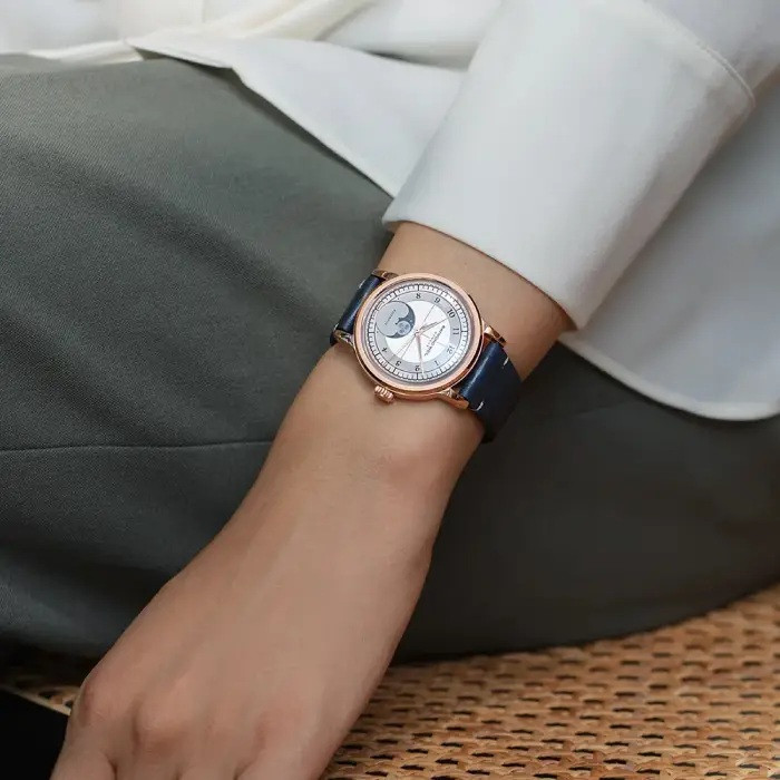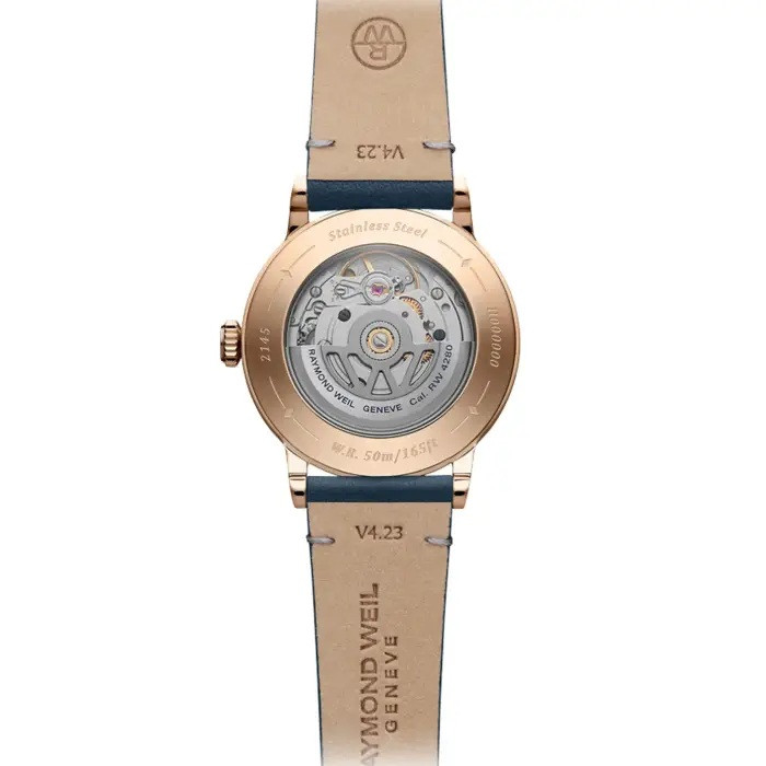 Часовник Raymond Weil Millesime 145-PC5-05650 е изящен символ на женственост и швейцарска прецизност. Корпусът от неръждаема стомана с розово-златно покритие (35 мм) е съчетан със сребърен секторен циферблат с индикация за лунна фаза, арабски цифри и стрелки със Super-LumiNova® покритие. В сърцето му работи автоматичният механизъм RW4280 с 41-часов резерв на енергия, а прозрачният заден капак от сапфир кристал разкрива красотата на движението. Тъмносинята кожена каишка придава елегантен контраст и комфорт, а водоустойчивостта до 5 ATM осигурява спокойствие при ежедневна употреба. Перфектният избор за дамата, която цени класата, детайла и безупречния стил.